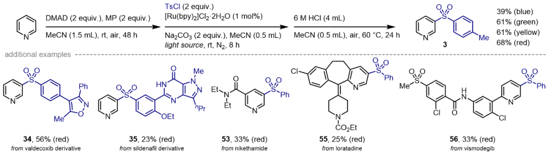 在最优光化学条件下,芳基、烯基甚至烷基磺酰氯都可以与吡啶进行选择性偶联,构筑结构多样的间磺化吡啶化合物库(图2)。反应能兼容多种常见官能团,包括氟、氯、溴、碘、酰胺、硫醚、甲酰基、酮基、氰基、三氟甲基、三氟甲氧基、磺酰基、硝基和氨基;也涵盖了空间位阻较大的取代基、五氟苯基、稠合芳烃以及噻吩、吡唑、吡啶等杂环芳烃。此外,三氟甲磺酰氯(CF3SO2Cl),可通过脱二氧化硫引入药学中极为重要的三氟甲基。需要特别指出的是,胺基磺酰氯由于其还原电位较低,通常需要硅烷激活;令人高兴的是,本方案也适用于胺基磺酰氯的直接活化,实现吡啶间位的胺基磺酰反应。不同电子效应基空间效应的吡啶前体都能进行间位选择性磺化,包括母体吡啶、单取代及二取代吡啶。该方法可以对吡啶药物分子进行后期官能化,如阿巴美帕尔(abametapir)、美替拉酮(metyrapone)、尼可刹米(nikethamide)、(S)-可替宁[(S)-cotinine]、氯雷他定(loratadine)、维莫德吉(vismodegib)及非布司他(febuxostat)等。