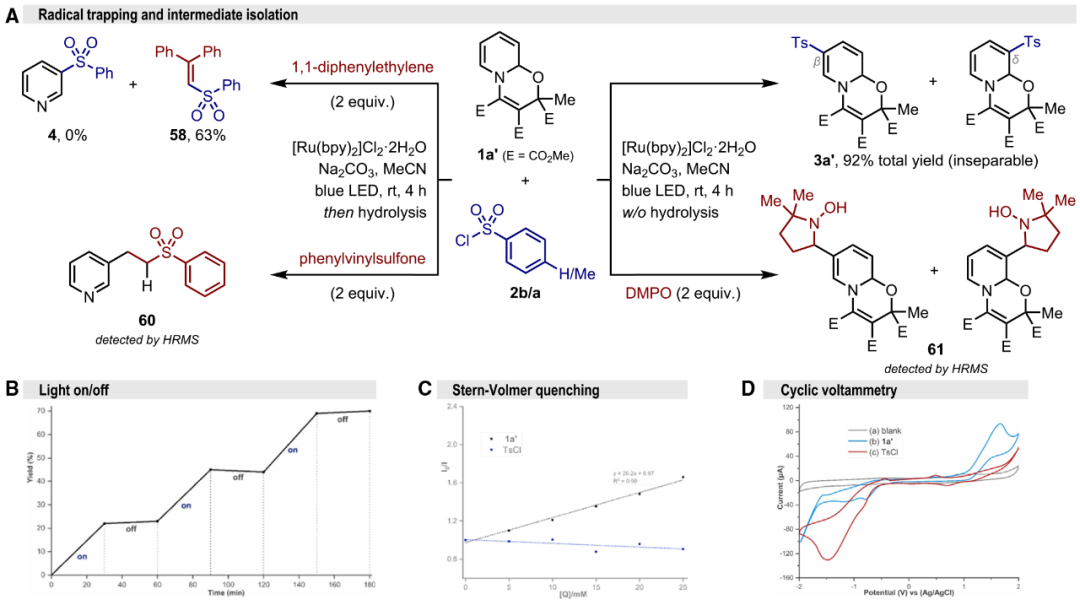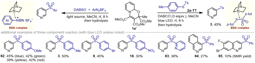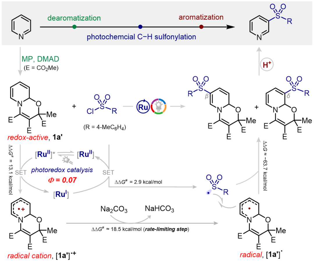 图2. 底物适用性考察(图片来源:Chem Catal.)上述三步反应可通过两锅或一锅法进行(图3),同样,多种光源可以进行反应,不过使用绿光、黄光或近红外光等能量较低光源时,反应收率明显较高。图3. 一锅法合成应用(图片来源:Chem Catal.)为了深入理解反应机制,作者首先进行实验机制研究(图4和图5)。自由基捕获实验证明了噁嗪并吡啶自由基和磺酰自由基的生成;中间体分离实验表明磺酰化可发生在氮原子β-和δ-位;光暗交替实验揭示该反应并非自由基链式反应;光敏剂淬灭实验清楚地表明激发态的光敏剂会被富电子的噁嗪并吡啶进行还原猝灭而驱动反应;在循环伏安法中,噁嗪并吡啶1a’在+1.66 V(vs Ag/AgCl)处出现阳极氧化峰,TsCl则在−1.48 V(vs Ag/AgCl)处显示较宽的还原信号。图4. 机理研究(图片来源:Chem Catal.)上述机理实验很好地支撑了所提出的反应机制(图5)。首先,吡啶、乙酰基二甲酸二甲酯(DMAD)和丙酮酸甲酯(MP)通过氧化还原中性的1,4-偶极环加成得到噁嗪并吡啶1a′;该脱芳构化中间体可还原猝灭激发态的Ru(II)光敏剂,从而转化为自由基阳离子[1a']·+; DFT计算表明该单电子转移(SET)过程的吉布斯自由能垒为13.1 kcal/mol;随后的碱协助脱质子过程为催化循环中的决速步(RDS,能垒约为18.5 kcal/mol),生成的噁嗪并吡啶自由基偏亲核性,可与亲电磺酰自由基[Ru(I)物种与TsCl进行SET过程再生活性Ru(II)光催化剂时所生成)迅速结合,释放至少63.7 kcal/mol的自由能,从而得到β-和δ-磺酰化的混合物。不过最终的酸介导再芳构化步骤将统一得到间位功能化吡啶。图5. 反应机理研究(图片来源:Chem Catal.)吡啶间位磺酰化反应还可通过噁嗪并吡啶、芳基重氮盐和DABSO的三组分偶联反应实现(图6),该反应无需外加光敏剂和碱,上述提到的多种光源(蓝/绿/黄/近红外光)均可驱动反应进行。紫外-可见吸收光谱实验表明DABCO与芳基重氮盐之间形成电子供体-受体(EDA)复合物,该络合物在光照射下进行分子内的SET步骤释放氮气生成芳基自由基生成和DABCO自由基阳离子;该自由基阳离子进而氧化噁嗪并吡啶,随后迅速脱质子生成噁嗪并吡啶自由基。同时芳基自由基捕获DABSO中的SO2产生磺酰基自由基,类似地,两种自由基进行极性匹配的自由基-自由基偶联筑建C−S键。此外,以对甲苯基对甲苯磺酸酯(2a-TT)同时作为磺酰源和电子受体,与DABCO形成EDA聚集体也可实现光化学吡啶间位磺化。图6. EDA光化学活化驱动吡啶间磺化(图片来源:Chem Catal.)综上所述,该团队率先探究了吡啶脱芳构化中间体的氧化还原活性,拓展其化学空间,借助光化学技术解锁吡啶间位功能化修饰,可实现磺酰基、磺酰胺基、三氟甲基多种重要药效团的高效引入,为间位取代的吡啶类药物的快速筑建和结构改造提供了新思路,也为后续基于吡啶骨架化合物库的活性分子筛选提供了物质基础。声明:本文仅用于学术文章转载分享,不做盈利使用,如有侵权,请及时联系小编删除。