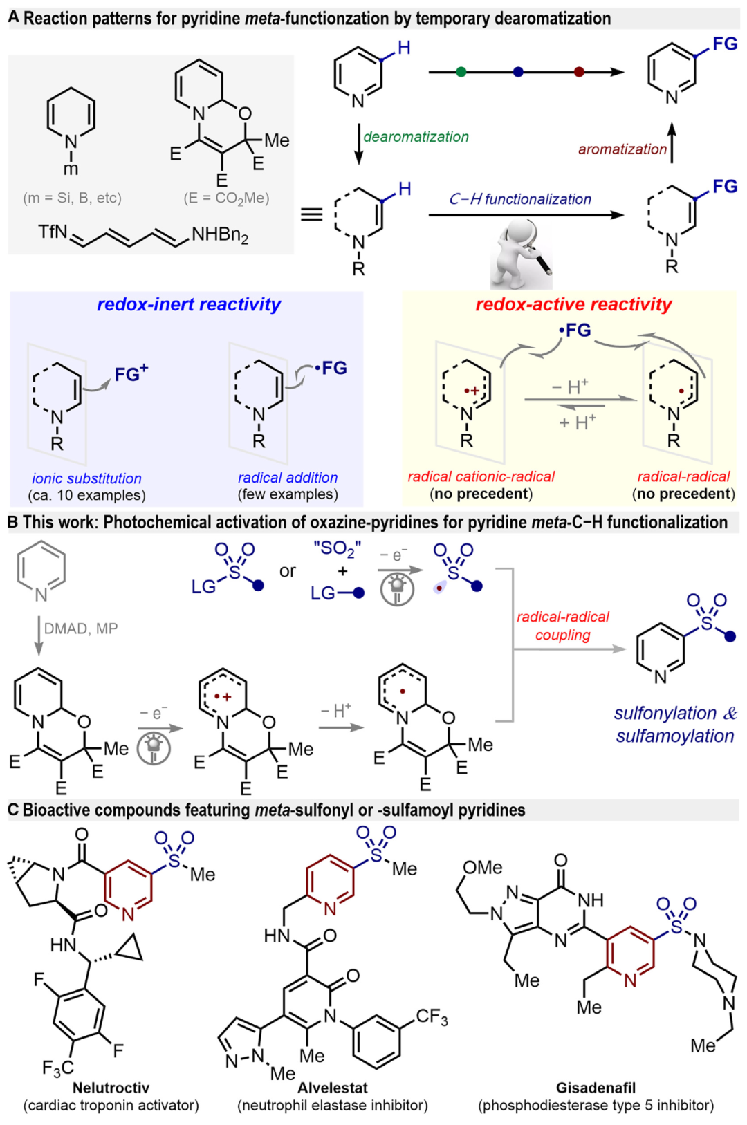 摘要:近日,广州医科大学药学院曾中一联合易伟、高辉教授首次揭示光化学激活脱芳构化吡啶中间体的氧化还原活性,解锁吡啶间位磺酰化、胺基磺酰化及三氟甲基化等重要转化;该方法具有特异的区域选择性、优异的官能团兼容性及后期官能化等特点。