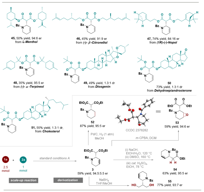 为了进一步证明该方法的实用性,作者将其应用于药物分子的后期修饰及衍生化研究。通过Pd/C氢气还原能够轻松得到底物52,通过环氧化可以将3转化为53,依次通过水解/脱羧/酯化可以得到底物54,最后通过NaBH4还原可以以77%的产率以及93:7的er值得到光学纯的1,3-二醇衍生物55。