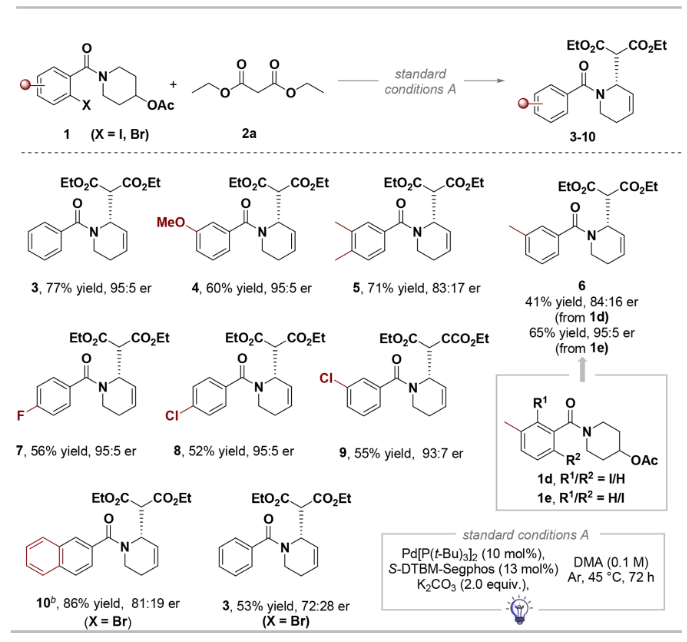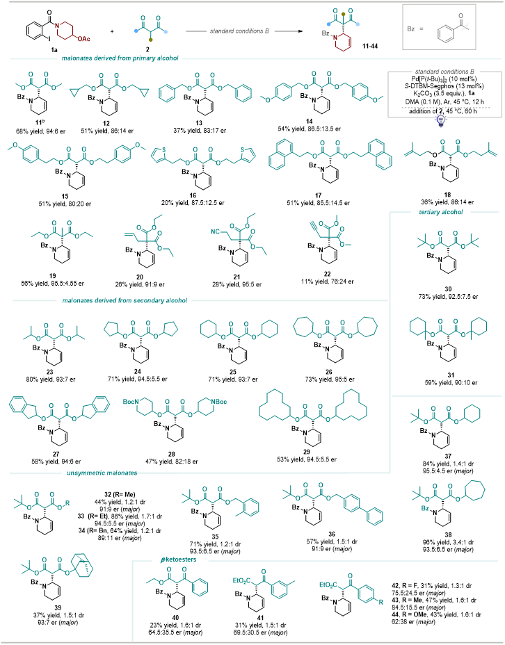 随后,作者对底物的适用范围进行考察,发现该策略对于带有不同取代基团的邻卤酰胺衍生物、通过一级,二级或者三级醇衍生的丙二酸酯或者酮酸酯均是适用的,最高能够以高达96%的产率以及95.5:4.5的er值得到相应的目标产物。