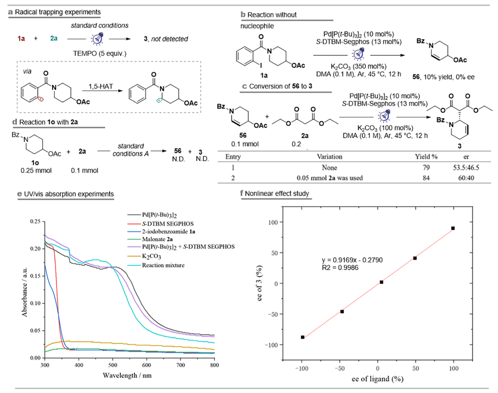 为了探究反应的机理,作者进行了一系列机理控制实验及理论计算研究。自由基捕获实验证明了该过程可能是经历自由基途径。同时,作者成功从反应体系中分离了烯丙基前体56,并且通过56与2a反应也能以几乎不变的产率得到底物3,证明了该反应可能是可见光催化去饱和/烯丙基亲核取代级联反应。随后作者通过1o与2a反应没有检测到56及3的生成,间接证明了1,5-HAT过程。紫外可见吸收实验表明钯催化剂与手性配体之间存在相互作用。在非线性实验中,产物3的吸收率与配体的吸收率呈良好的线性关系,表明这一转化是由1:1比例的钯/配体复合物催化的。