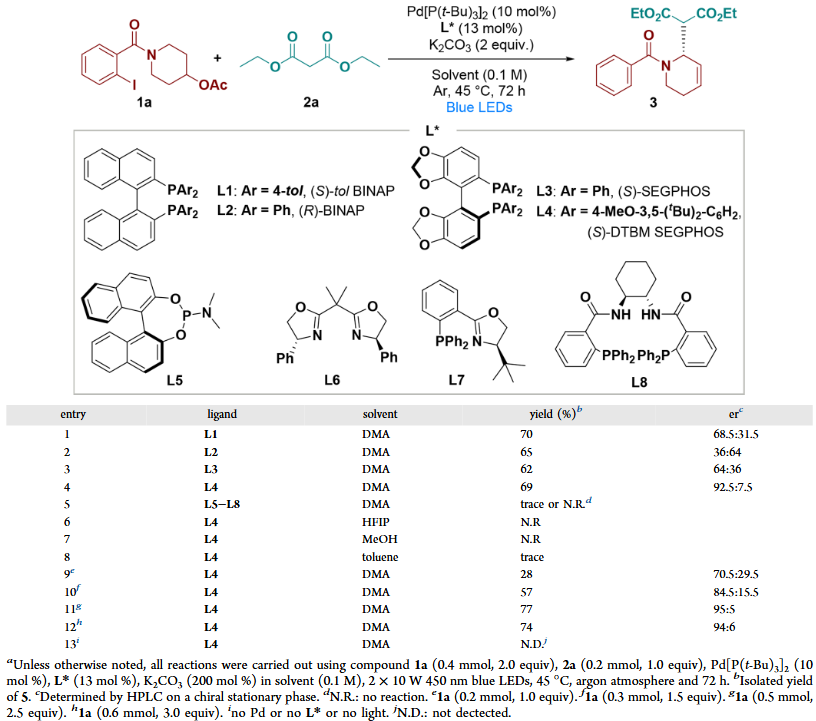 首先,为了验证方法的可行性,以1-(2-碘苯甲酰基)哌啶-4-乙酸酯(1a)与丙二酸二乙酯(2a)为模型底物进行条件筛选。结果表明,利用可见光诱导钯催化去饱和/烯丙基亲核取代反应级联构建具有光学纯的烯丙基烷基化物的策略是可行的,通过对钯催化剂、手性配体、溶剂、温度以及底物当量等因素进行筛选,成功实现了该反应的高对映选择性及区域选择性转化。值得注意的是,底物1a与2a之间的比例对于产率以及er值都至关重要。最终确定了反应的最佳条件:2.5倍单量的1a与1倍单量的2a在以Pd[P(t-Bu)3]2为催化剂,K2CO3为碱,S-DTBM Segphos为手性配体,DMA为溶剂,氩气氛围中45℃蓝光照射72小时。