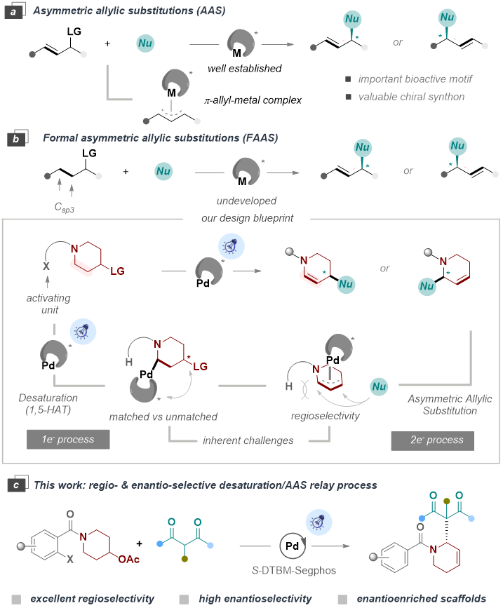 近日,中南大学阳华/向皞月/陈凯课题组在该领域取得突破,报道了一种可见光诱导钯催化哌啶支架的不对称烯丙基取代反应,通过光催化去饱和/烯丙基亲核取代级联反应合成了一系列具有高对映选择性及区域选择性的光学纯的烯丙基烷基化物。