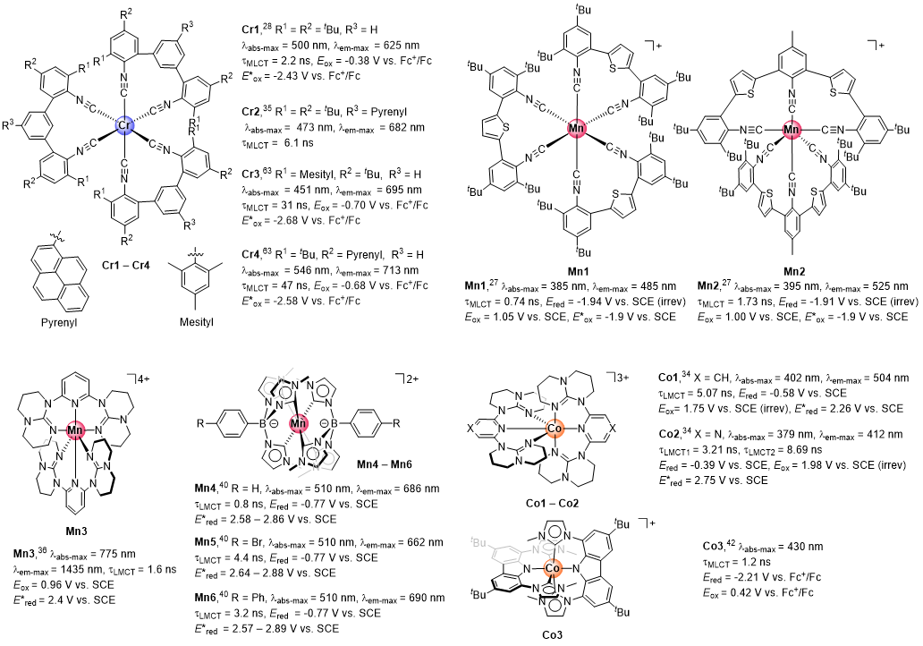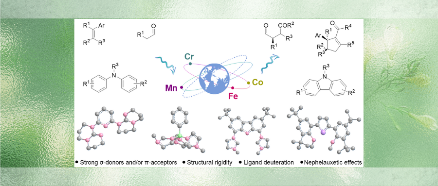 可见光催化剂的发展是当前光化学合成领域的前沿热点之一。在众多光催化剂中,第一过渡系金属配合物因其金属资源丰富、氧化还原性质可调以及独特的催化性能而受到广泛关注。通过合理设计配体的电子结构与空间构型,研究人员已成功合成出多种基于铜(Cu)、镍(Ni)、铁(Fe)、钴(Co)、铬(Cr)、锰(Mn)等金属的光活性配合物。这些新型配合物展现出优异的光物理和光化学性质,在激发态行为和催化活性方面表现出独特优势,显著区别于传统的贵金属配合物(如Ir、Ru基催化剂)以及有机染料类光敏剂。