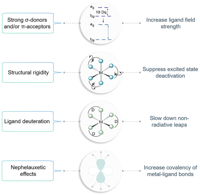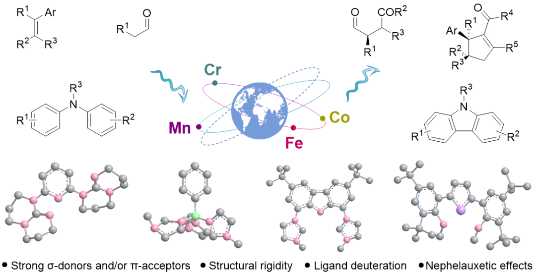文章系统总结了光活性第一过渡系金属配合物的发展历程,重点评述了铬(Cr)、锰(Mn)、钴(Co)和铁(Fe)配合物作为三重态光敏剂或光氧化还原催化剂在有机合成中的应用。论文开篇展示了对该领域发展做出重要贡献的Key Scientists;接着,总结了此类催化剂的设计原则,即配体场调控、振动与结构控制、电子云扩展效应的优化以及π共轭体系的拓展(图2)。