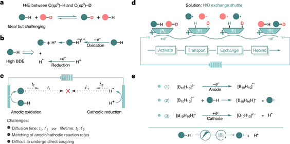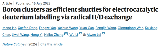 2025年7月15日,武汉大学化学与分子科学学院雷爱文/李武/张海波团队在国际权威学术期刊《自然·催化》(Nature Catalysis, IF: 44.6)在线发表题为“Boron clusters as efficient shuttles for electrocatalytic deuterium labelling via radical H/D exchange”的研究论文。化学与分子科学学院何萌博士、邓雪帆博士和姚丰泽为论文共同第一作者,武汉大学雷爱文教授、李武教授、张海波副教授为论文通讯作者,武汉大学为唯一通讯单位。