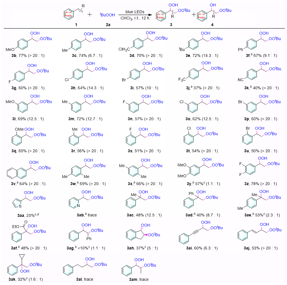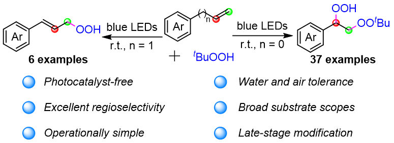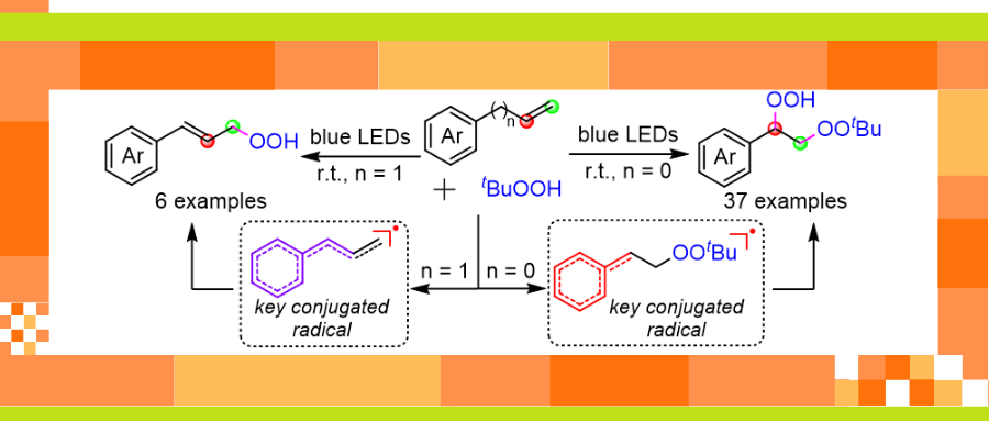 利用可见光驱动,在无光催化剂的条件下,广东石油化工学院刘卫兵教授课题组报道了一种芳基烯烃与叔丁基过氧化氢(TBHP)的双过氧化反应,实现了α,β-双过氧化物的区域选择性合成。据团队所知,这是首次利用TBHP同时作为叔丁过氧基和氢过氧基双功能自由基源的自由基反应。此外,当以烯丙基苯及其衍生物为反应物时,可获得烯丙基取代的过氧醇类产物。机理研究表明,氢过氧基源自叔丁过氧基团与TBHP的转化反应。