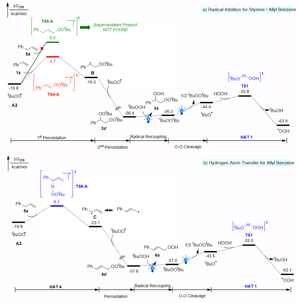 Scheme 6 a) Profiles of the addition pathways for the styrene or allyl benzene substrates in the bisperoxidation pathway; b) profiles of the HAT pathways for the allyl benzene substrate in the hydroperoxidation pathway(来源:Green Chem.)