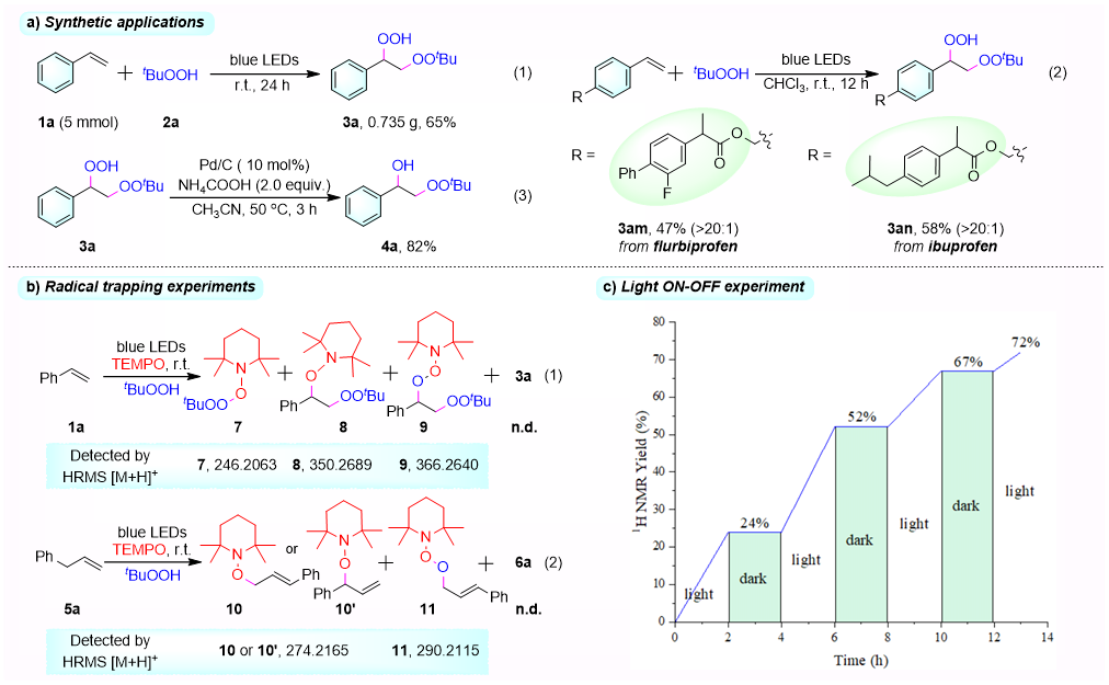 总而言之,这项工作开发了一种绿色合成方案:在无光催化剂条件下,通过可见光诱导的芳基烯烃与TBHP双过氧化反应,实现α,β-双过氧化物的合成。该方法具有反应条件温和、官能团耐受性广及优异区域选择性的特点。重要的是,该策略可实现药物衍生物(如氟比洛芬、布洛芬)的后期官能团化,为先导药物开发提供新途径。此外,烯丙基苯衍生物发生选择性氢过氧化反应,生成烯丙基取代过氧醇,拓展了底物适用范围;机理研究表明:氢过氧基(–OOH)源自叔丁过氧基(–OOtBu)与TBHP的转化反应。自由基捕获实验与理论计算证实:叔丁过氧自由基在转化过程中生成,并参与后续双过氧化/过氧化反应。尽管涉及多种自由基物种,但双过氧化物与3-苯基丙烯基过氧化物均源自过氧化反应与氢原子转移(HAT)路径产生的自由基共轭中间体;该研究所发展的TBHP-烯烃过氧化体系,将为药物合成、功能材料及绿色合成领域提供系统性指导。
