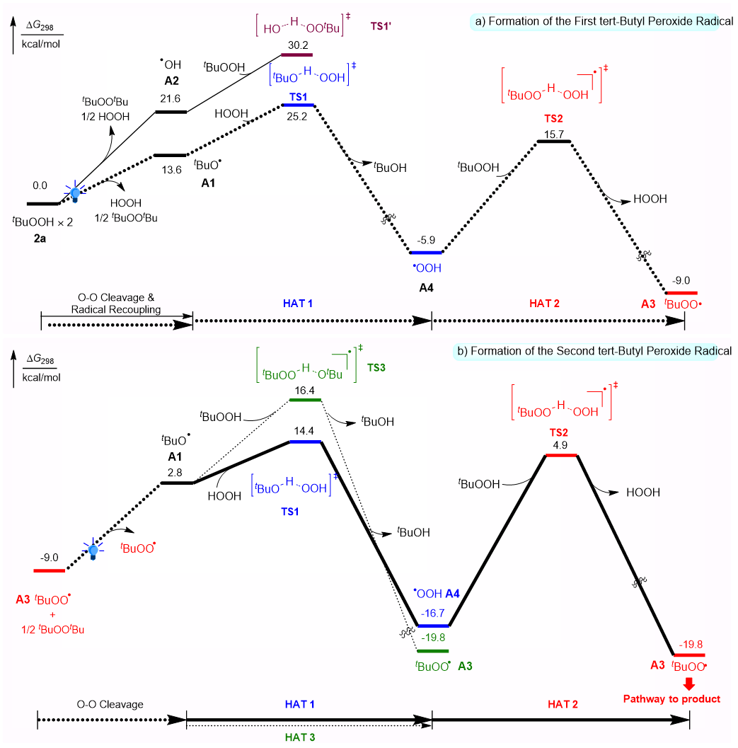 TBHP存在三种键断裂方式,所需能量各异。尽管O-H键断裂能垒较高,其研究最为深入。因O-O键解离能较低(≈43.6 kcal/mol),TBHP倾向发生O-O断裂,生成tBuO·通过氢攫取产生新自由基并转化为tBuOH。而高活性·OH难以控制,通常被还原为HO⁻。近期,该课题组成功实现烯烃与TBHP的羟基官能化,证实羟基源自TBHP,并通过Cu(I)催化氧化/叔丁氧基化捕获tBuO·。