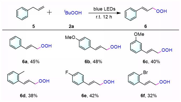 Scheme 3 The substrate scope for synthesis of allyl peroxyl alcohol 6(来源:Green Chem.)