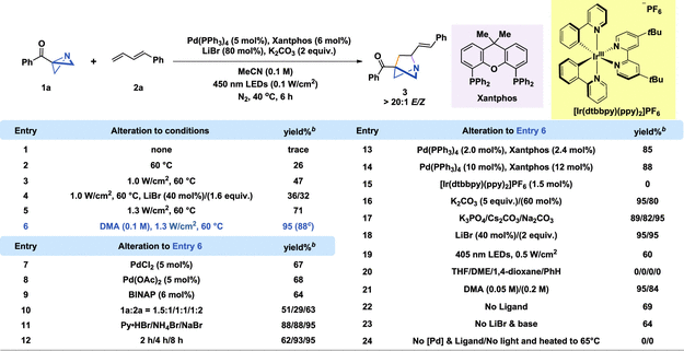 作者使用ABB 1a和 1,3-二烯2a为模型底物,Pd(PPh3)4作为催化剂,MeCN作为溶剂,在水冷光反应器中对光诱导Pd催化合成1-aza-BCH进行条件优化。优化发现温度对反应收率有极大影响,将温度升高到 60°C 可以显著提高反应性,可能是由于亲核攻击增强所致(图2,entry 2)。增加光子通量也可以进一步提高收率:光强度为 1 W/cm2和 1.3 W/cm2 时产率分别提高到 47%(图2,entry 3)和 71%(图2,entry 5)。使用高沸点的溶剂也可显著提高产率。作者还筛选了其他Pd催化剂及用量、光催化剂、光源、时间、碱、溶剂等,并对照实验证实了钯、配体、LiBr 和 K2CO3以及高光子通量光对高产率的必要性。