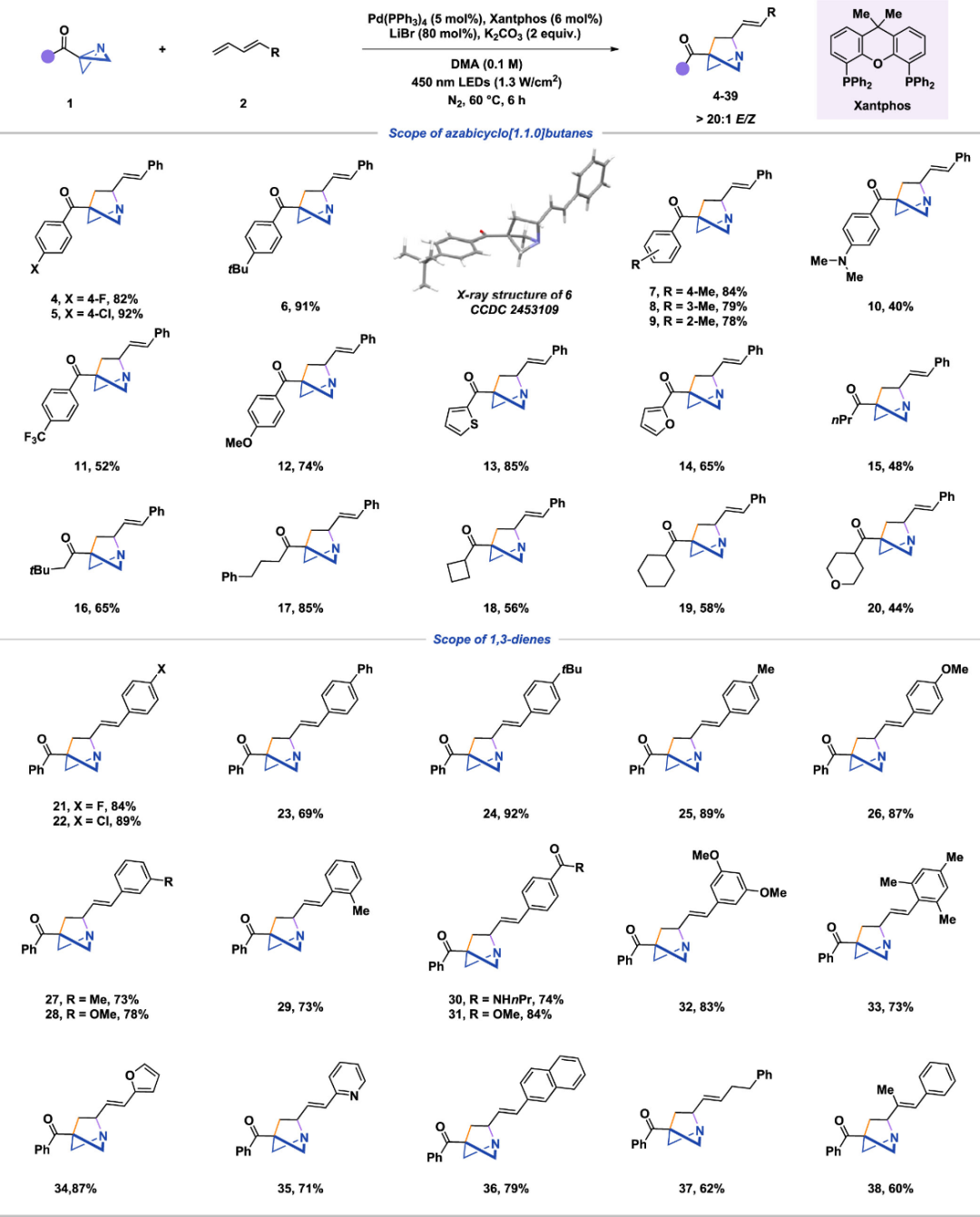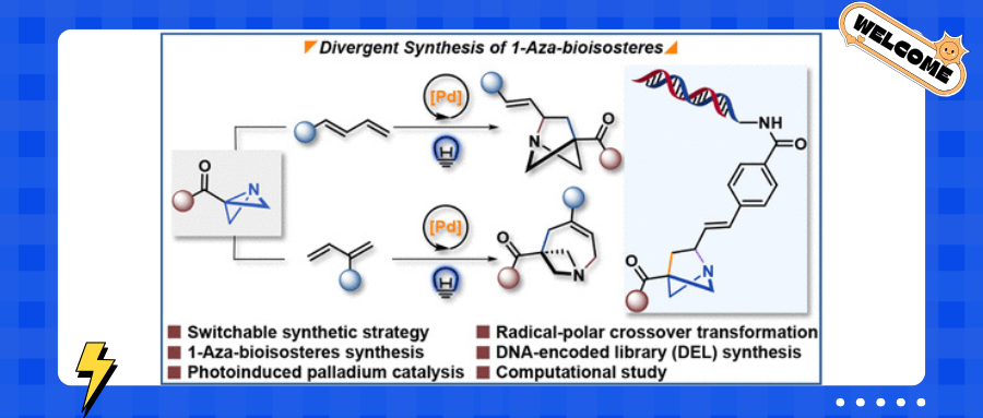 上海科技大学黄焕明课题组使用ABB作为自由基前体,在可见光照射下,光激发的钯催化剂与激活的 ABB反应,生成稳定的α-酮自由基,与1,3-二烯进行区域选择性加成(图1 C)。形成的烯丙基钯中间体与氮中心阴离子发生选择性亲核进攻,最终实现区域选择性发散的1-氮杂双环[2.1.1]己烷和1-氮杂双环[4.1.1]辛烯这两类氮杂生物电子等排体的合成。