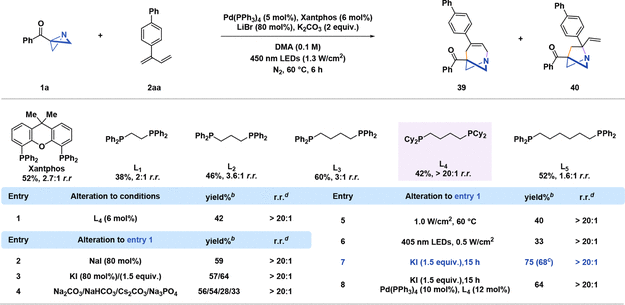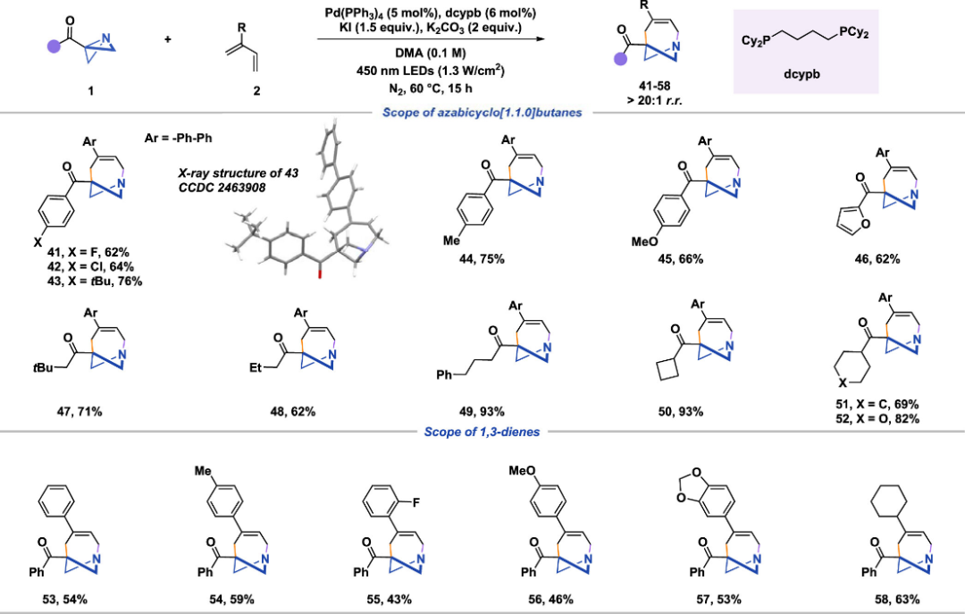在优化1-aza-BCHs合成的基础上,作者观察到用2-芳基-1,3-二烯取代1-芳基-1,3-二烯会形成含有1-氮杂双环[4.1.1]辛烯和1-氮杂双环[2.1.1]己烷的混合物,比例为 2.7:1(图4)。通过配体筛选,作者发现烷基双齿膦配体L4能够以优异的化学选择性生成产物1-氮杂双环[4.1.1]辛烯(图4,entry 1)。进一步优化表明,用碘离子代替溴离子(图4,entry 2&3),再加上增加化学计量当量,可以显著提高反应收率。