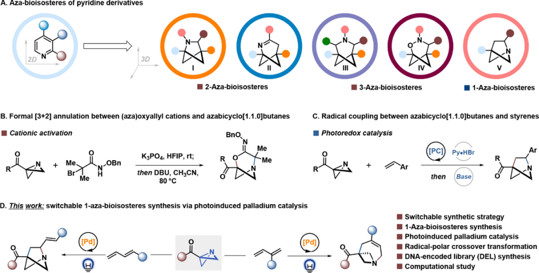 吡啶是上市药物中第二常见的环状体系,近些年来,在“escape from flatland”概念的推动下,三维氮杂生物电子等排体已成为药物化学中吡啶环的有力替代结构,并引发了众多科研工作者的关注(图1A)。在之前的工作中,2-氮杂生物电子等排体和3-氮杂生物电子等排体已经有了较多的报道,然而,1-氮杂双环[2.1.1]己烷(1-aza-BCHs)的合成路线仍然很少,开发1-aza-BCH温和且广泛的合成方法则成为了值得探讨的研究热点。