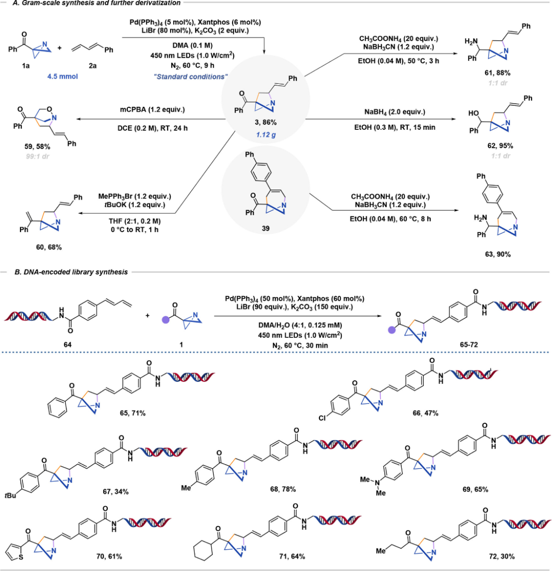 为了证明该方法的实际适用性,作者进行了4.5 mmol规模的克级反应,得到了棕色油状所需产物3,分离产率为 86%(1.12 g),并进行了衍生化(图6 A)。不仅如此,作者进一步将该方法扩展到DNA编码化合物库(DEL)的合成(图6 B)。通过酰胺缩合将1,3-二烯与DNA头段连接的胺基末端结合,在温和的反应条件下成功实现了1-氮杂双环[2.1.1]己烷的掺入DNA的合成策略。该方法能够与多种ABB高效偶联,从而能够将双环结构精准地安装到DNA骨架上,从而拓展DNA编码库的结构多样性。