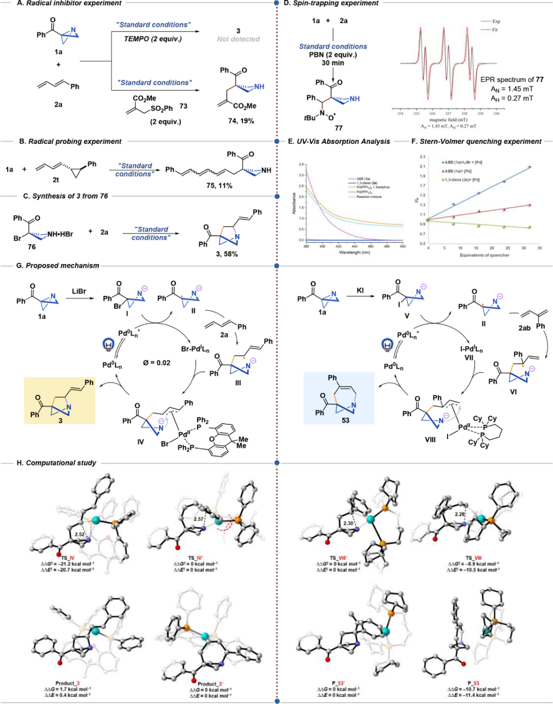 最后,作者进行了机理探究(图7)。作者TEMPO进行自由基抑制实验,产物的形成被完全抑制(图7 A,上)。用2-((苯磺酰基)甲基)丙烯酸甲酯捕获,得到自由基加合物,证实了自由基中间体II的存在(图7 A,向下)。使用含环丙烷的二烯在标准条件下反应,可以得到开环产物,证明发生了自由基开环。卤代中间体经标准条件反应也能以58%收率得到产物,证明底物ABB和LiBr原位生成卤代物参与反应。利用PBN捕获的EPR实验进一步验证了该机理(图7 D)。以上结果表明反应过程中生成了α-羰基自由基II。紫外可见吸收分析表明Pd(PPh3) 4在反应波长(450 nm)处有光吸收,从而证实了Pd(PPh3) 4作为本体系中有效的光催化剂被光活化(图7 E)。此外,结合我们的机理研究,Stern–Volmer 猝灭研究表明,钯催化剂仅被烷基溴化物I猝灭。