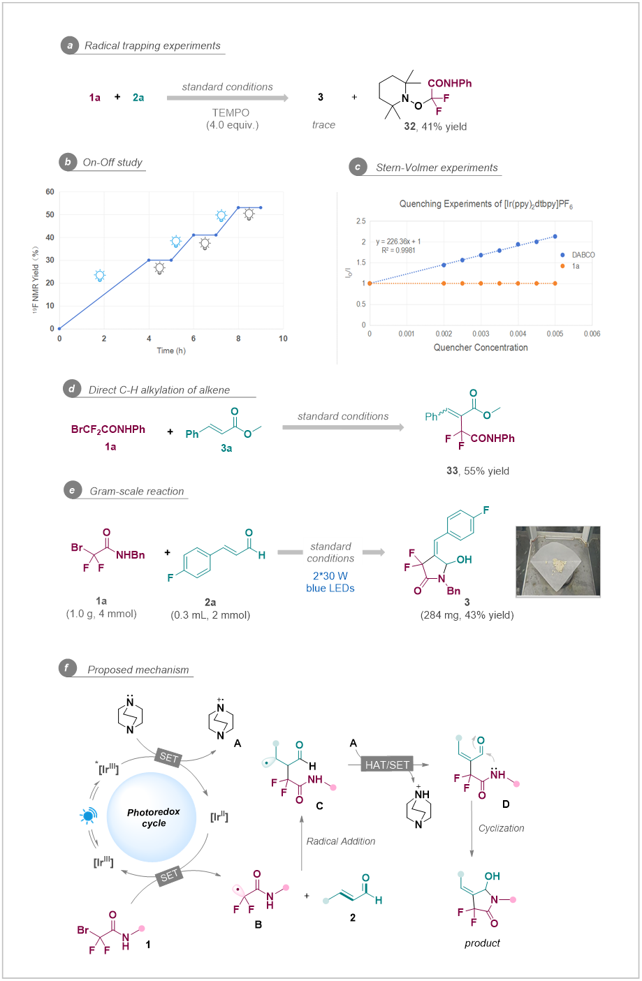 随后,作者为了阐明该反应的机理,进行了一系列控制实验(图4)。自由基捕获实验说明反应可能涉及二氟烷基自由基的形成(图4a)。开关灯实验表明反应不太可能涉及自由基链式反应机制(图4b)。此外,荧光猝灭研究表明,DABCO能够有效地猝灭光催化剂的激发态,支持这两种物质之间的直接相互作用(图4c)。在标准条件下,用肉桂酸甲酯3a代替肉桂醛2,与1a反应,烯烃部分直接C-H烷基化,得到产率为55%的产物33(图4d)。最后,为了证明该方案的适用性,在标准条件下进行了2 mmol规模的反应,以43%的收率产生了284 mg的产物3(图4e)。基于上述实验结果,作者提出了可能的反应机理:首先,可见光激发的光催化剂与DABCO发生单电子转移(SET)过程,生成DABCO阳离子自由基A。随后,IrII继续与溴代氟乙酰胺发生单电子转移(SET)过程,生成二氟烷基自由基B。随后,它与肉桂醛发生区域选择性自由基加成,生成自由基C。然后与先前生成的DABCO阳离子自由基发生氢原子转移(HAT)或单电子转移(SET)过程生成中间体D,最终发生分子内半氨基化反应生成所需产物E。