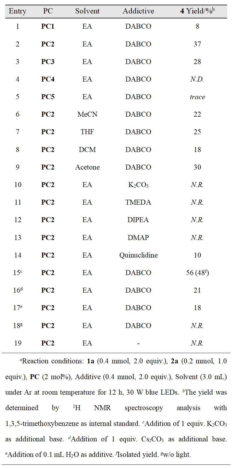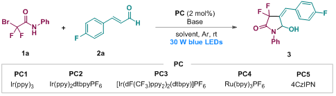 首先,作者以2-溴-2,2-二氟-N-乙酰苯胺(1a)和4-氟肉桂醛(2a)的反应为模型(表1)。对包括溶剂以及碱类在内的实验参数进行了大量筛选(图2);并获得了最佳反应条件: 2.0当量的1a,1.0当量的2a,以2.0当量的DABCO为添加剂,以1.0当量的K2CO3为碱,EA (3.0 mL)为溶剂的条件下于氩气气氛及30 W 450 nm蓝光照射下反应12小时,便可以以最优48%的分离产率获得目标产物3(图2, entry 15)。