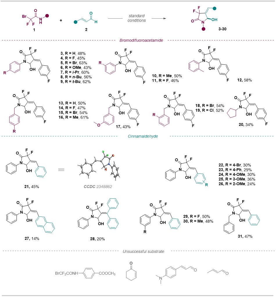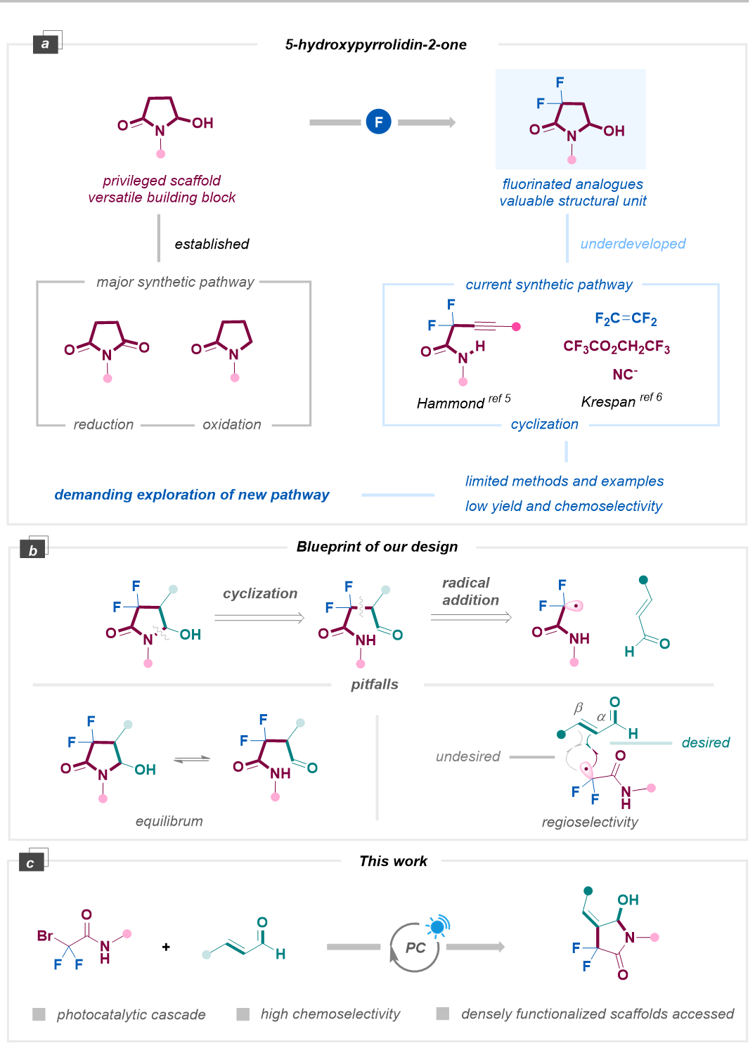 5-羟基吡咯烷-2-酮是一类多功能的含氮骨架,在现代合成化学中一直作为高价值的合成中间体和构建模块。传统上,主要的合成途径主要依赖于琥珀酰亚胺的化学选择性还原和吡咯烷-2-酮的氧化。获取氟化吡咯烷-2-酮的案例和途径非常有限。Hammond开发了一种新颖的分子内氢胺化反应来制备3,3-二氟-5-羟基吡咯烷-2-酮。Krespan报道了通过涉及氰离子、四氟乙烯和氟代酯的环化反应生成高度氟化的5-羟基吡咯烷-2-酮(图1a)。从逆合成分析的角度来看,3,3-二氟-5-羟基吡咯烷-2-酮可以通过分子内环化到半醛基团和gem-二氟烷基自由基对烯醛的加成(图1b)来方便地获得,这将形成连续的C-C和C-N键。然而,这种策略面临两个关键挑战:(i)在环化过程中产生的半醛骨架的热力学不稳定性;(ii)gem-二氟烷基自由基对烯醛加成时的竞争区域选择性。考虑到解决这些竞争的区域选择性和热力学稳定性问题的重要性,并解锁这一未探索的化学领域。基于前期课题组对酰胺和偕二氟基团以及其性质的研究(ACS Catal. 2024, 14, 3725-3732; Org. Lett. 2024, 26, 2108-2113; Org. Lett. 2024, 26, 1478-1482; Org. Lett. 2021, 23, 9474−9479),近日,中南大学阳华/陈凯课题组报道了一种通过光氧化还原级联反应,以优异的区域选择性快速获得一系列有价值的、高度官能团化的5-羟基吡咯烷-2-酮(方案1c)。作者设想溴二氟乙酰胺可以作为双功能试剂,在光催化条件下生成gem-二氟烷基自由基,并与肉桂醛进行选择性加成/半醛化反应。基于这一理念,开发一种新颖的光还原-氧化级联反应,以优异的区域选择性快速获得一系列有价值的、高度功能化的5-羟基吡咯烷-2-酮(图1c)。相关研究成果发表在The Journal of Organic Chemistry (DOI: 10.1021/acs.joc.5c02040)上。