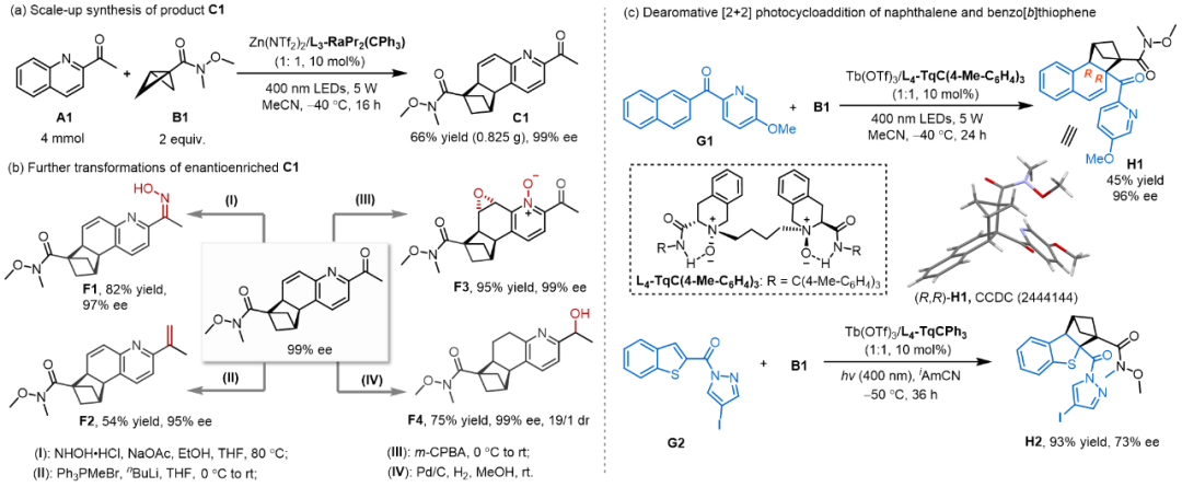 该反应可放大至克级规模,产物C1能通过一系列转化得到区域/对映选择性保持的各类官能团化的产物(图5a、b)。值得提及的是,反应体系对萘衍生物和苯并噻吩衍生物也能很好兼容(图5c)。