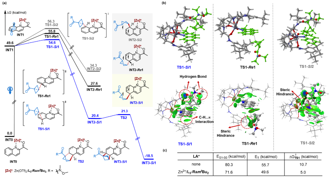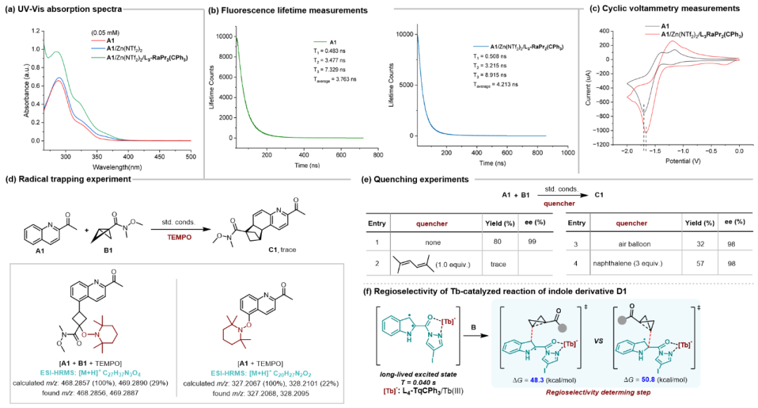 作者通过紫外-可见吸收光谱和测量荧光寿命发现手性Lewis酸的加入不仅能使底物A1的吸收发生红移,并且增加荧光寿命,使得Lewis酸活化的底物在可见光下能被选择性激发,从而有效避免背景反应(图6a,b)。底物的氧化还原电势(图6c)、自由基捕获(图6d)、淬灭(图6e)、以及量子产率测量等实验证明了反应经历三线态双自由基历程。最后,作者通过DFT计算,提出了可能的反应机理和催化循环,解释了反应区域和立体选择性的来源(图7)。其中,底物取代基决定/配体位阻影响反应区域选择性,催化剂中配体与底物间的C-H…π和氢键弱相互作用对反应的立体选择性控制至关重要。