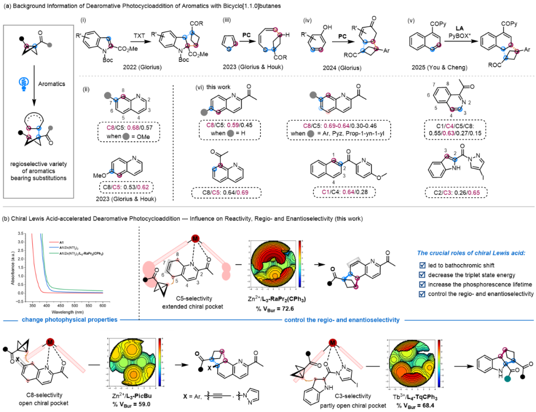 可见光诱导(杂)芳烃的去芳香化环加成反应因反应效率和选择性高、条件温和等优点,近年来受到化学家们的广泛关注(图1a)。尽管如此,由于涉及区域、非对映、对映等多种选择性控制,可见光诱导(杂)芳烃的直接不对称去芳香化环加成反应难度高,研究报道相对较少。鉴于取代基立体电子性质显著影响芳环上电子自旋布居,进而影响反应的区域、非对映和立体选择性控制,喹啉化合物的直接去芳香化环加成反应极具挑战性。