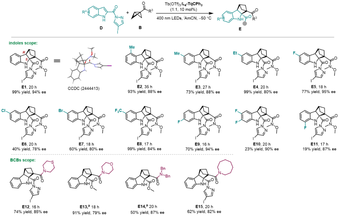当使用Tb(OTf)₃/L₄-TqCPh₃ 为手性催化剂时,一系列取代的吲哚底物能够与BCB反应,高效高选择性地合成哚啉稠合双环[2.1.1]己烷(BCHs)类化合物(图4)。