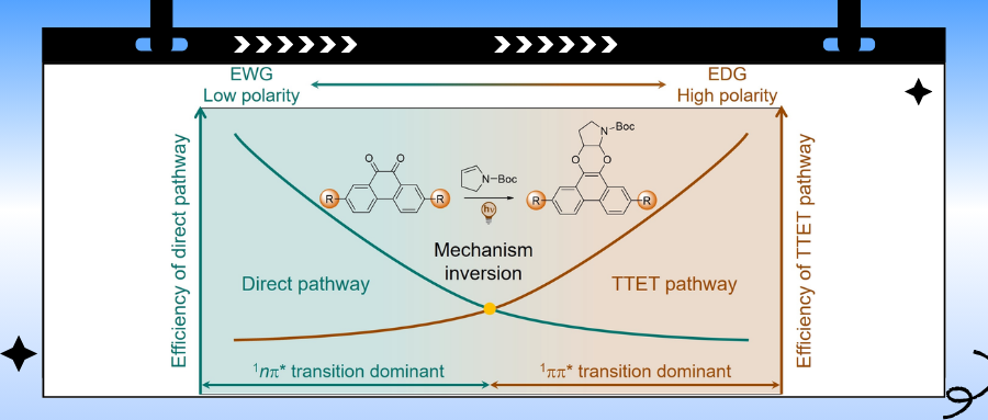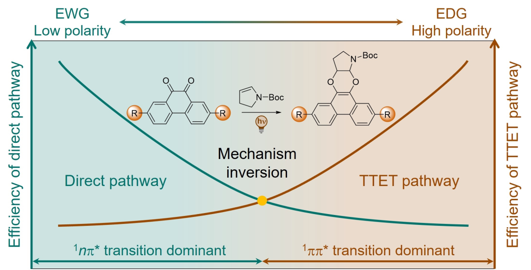 为解决这一问题,南京林业大学付幼心教授,2016年诺贝尔化学奖得主荷兰格罗宁根大学Ben Feringa教授联合浙江大学张鉴予研究员在前期研究的基础上(Nat. Rev. Chem. 2024, 8, 665–685; J. Am. Chem. Soc. 2021, 143, 10041–10047; Angew. Chem. Int. Ed. 2024, 63, e202319321; Angew. Chem. Int. Ed. 2023, 62, e202218203; Chem. Sci. 2023, 14, 7465-7474.),以9,10-菲醌(9,10-phenanthrenequinones, PQs)-富电子烯烃(electron-rich alkenes, ERAs)光点击反应为切入点,首次提出了“光点击反应机制反转”调控策略(见下图),通过官能团电子效应以及溶剂极性协同作用,成功实现了可见光诱导下光点击反应在直接反应机制与三重态敏化机制之间的转换。团队设计合成了一系列2,2’-位取代的PQ衍生物,系统调节其电子效应(吸电子基团至给电子基团),结合瞬态吸收光谱与理论计算,发现取代基变化可诱导PQ分子最低单重激发态(S1, 1nπ* → 1ππ*)能级反转,从而调控系间窜越效率与三重态布居,实现光点击反应直接机制与三重态敏化机制的精准切换。吸电子基团修饰的PQ衍生物在直接路径下表现出高达11,470 M-1s-1的二阶反应速率常数,创PQ-ERA光点击反应体系报道最快纪录。