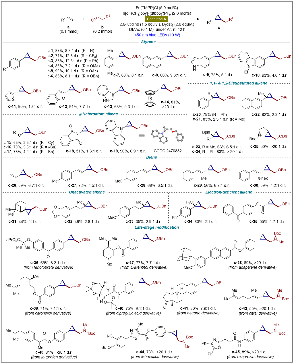 研究方案首先探究了烯烃环丙烷化反应的范围(图 2)。反应体系可以很好的兼容各种类型的烯烃,包括:乙烯基芳烃、α-杂原子烯烃、1,1-二取代烯烃、1,2-二取代烯烃、1,3-二烯、非活化烯烃及缺电子烯烃,并能以中等到优异的产率得到环丙烷化产物。同时,对于一些药物分子、天然产物、生物活性分子衍生物的环丙烷化合成也具有优异的表现。