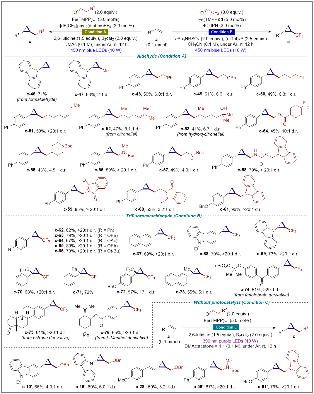 接着进一步考察卡宾前体的适用范围,简单的烷基醛、含卤素、烯烃、羟基、酯基、Boc/Fmoc保护氨基的烷基醛也能成功的实现卡宾的转化,高效地构建环丙烷产物。同时,该方法还成功拓展至三氟乙醛水合物,用于构建含三氟甲基的环丙烷,产物具有优异的立体选择性和生物活性潜力。此外,在无光氧化还原催化剂的条件下,也能顺利的实现烷基醛与烯烃的直接环丙烷化反应(图 3)。
