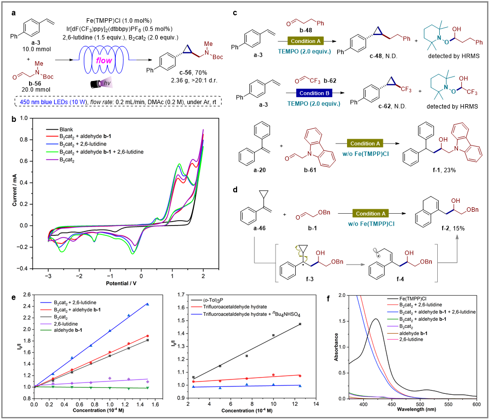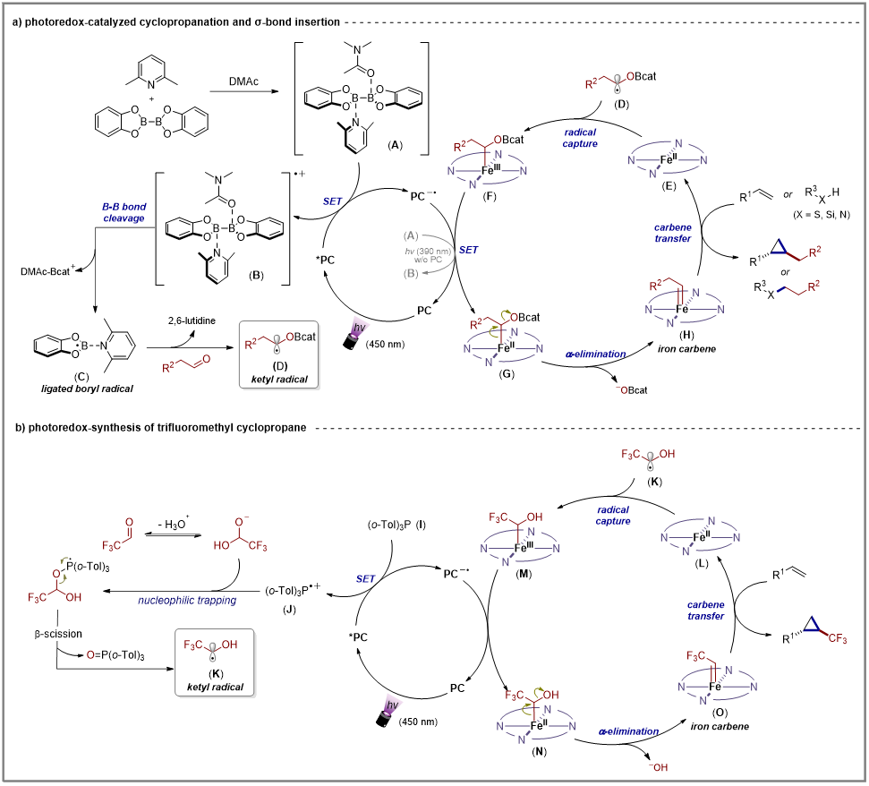 基于该金属光氧化还原催化环丙烷化策略的广谱适用性,我们进一步验证了其规模化潜力。将反应过程通过可扩展的连续流动反应装置进行了放大处理(图 5a),与传统方法相比,反应速度大大提高。为探究该金属光氧化还原催化环丙烷化反应中B2cat2与2,6-二甲基吡啶的相互作用,我们进行了循环伏安(CV)研究(图 5b)。此外,为了深入阐明反应机制,我们开展了系统实验研究,例如自由基捕获实验(图 5c)、自由基钟实验(图 5d)、Stern-Volmer淬灭实验(图 5e)、紫外-可见吸收光谱实验(图 5f)。最终提出了可行的反应机理(图 6),在光氧化还原催化的环丙烷化及σ键插入反应(条件A)中(图6a),光诱导反应的引发始于2,6-二甲基吡啶、B2cat2与DMAc形成复合物(A)。在可见光照射下(λ = 450-455 nm),复合物(A)可还原淬灭激发态光催化剂(PC*),生成自由基阳离子中间体(B),同时产生还原态光催化剂(PC⁻•)(条件A)。或者,在无外源光催化剂时,原位形成的电子供体-受体(EDA)复合物(A)可被紫光(λ = 390-395 nm)有效激发,其激发态中间体经铁(III)-卟啉络合物(F)氧化淬灭,形成自由基阳离子中间体(B)与低价态铁(II)络合物(G)(条件C)。自由基阳离子(B)发生硼-硼键断裂,生成关键的吡啶配位硼自由基物种(C)。该物种进攻醛的羰基形成酮基自由基(D)。与此同时,Fe(TMPP)Cl催化剂从Fe(III)还原为Fe(II),形成铁(II)络合物(E)。此铁(II)络合物(E)可捕获酮基自由基(D),经单电子转移(SET)过程释放低价态铁(II)络合物(G),同时完成光催化循环并再生光催化剂(PC)。低价态铁(II)络合物(G)经α-消除形成高活性铁卡宾中间体(H),该中间体依次进行环丙烷化与σ键插入步骤,最终获得目标产物并使铁催化剂重置为铁(II)络合物(E)。在三氟甲基环丙烷化体系(条件B)中(图6b),激发的光催化剂(PC*)被三(邻甲苯基)磷通过单电子转移过程还原淬灭,生成还原态光催化剂(PC⁻)物种与三(邻甲苯基)磷自由基阳离子(J)。随后,三(邻甲苯基)磷自由基阳离子经去质子化的三氟乙醛水合物亲核捕获,形成磷烷基自由基(K),该自由基经β-断裂生成酮基自由基中间体(L)。该酮基自由基中间体通过光氧化还原与铁催化循环的协同作用,高效构建三氟甲基环丙烷产物。