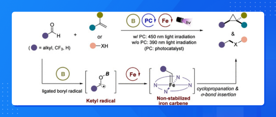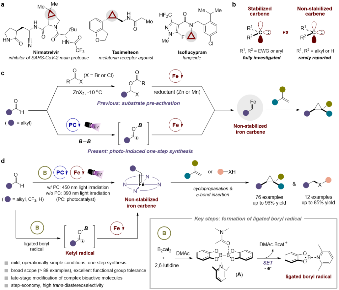 环丙烷结构广泛存在于药物、天然产物和生物活性分子中,其刚性结构可增强与生物靶点的结合能力,并作为烷基/芳基的生物电子等排体,能提高药物代谢稳定性。卡宾与烯烃[2+1]环加成反应是合成环丙烷骨架结构最有效、直接的策略之一,但依赖重氮化合物作为卡宾前体,尤其烷基取代重氮化合物存在高反应性、爆炸风险(如放热自发分解),限制了其应用。近年来,研究者尝试开发非重氮类卡宾前体(如偕二卤化物、磺酰腙等),但普遍存在底物需预活化、反应条件苛刻、适用范围窄等问题。因此,开发一种从廉价、稳定、易得的脂肪醛出发,直接生成非稳定卡宾并实现环丙烷化的新策略,具有重要的科学意义和应用价值。