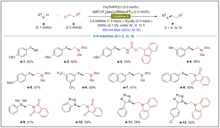 该方法不仅可用于环丙烷化,还可拓展至σ键插入反应,包括S–H、Si–H和N–H键的插入,生成硫醚、硅烷和胺类化合物。这些多样化σ键插入反应的成功实施,不仅证实了烷基铁卡宾中间体突破成环反应的反应机制,更确立了其作为高活性中间体在本自由基策略中的普适性。(图4)。