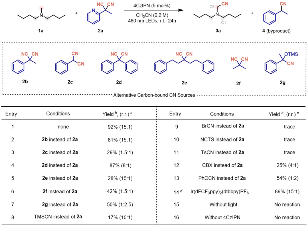 随后作者评估了MPYMN在具有挑战性的胺类化合物位点选择性氰化反应中的反应性能。以N-甲基二丁胺(1a)为模型底物进行系统优化表明:在乙腈溶剂中,使用5 mol% 4CzIPN作为光催化剂,于25℃、460 nm LED光照下反应24小时,可获得92%收率的氰基化产物3a(15:1 r.r.),同时生成等当量的副产物4(表1,条目1)。氰化反应优先发生在甲基位点而非取代度更高的亚甲基位点,证实了MPYMN的空间位阻效应可引导区域选择性朝向位阻较小的位置。与其他C-CN键氰化试剂的对比研究表明,MPYMN具有较高的应用潜力。值得注意的是,MPYMN在反应活性和选择性方面均优于商品化氰化试剂。对照试验表明光照和光催化剂都是不可缺少的反应条件。
