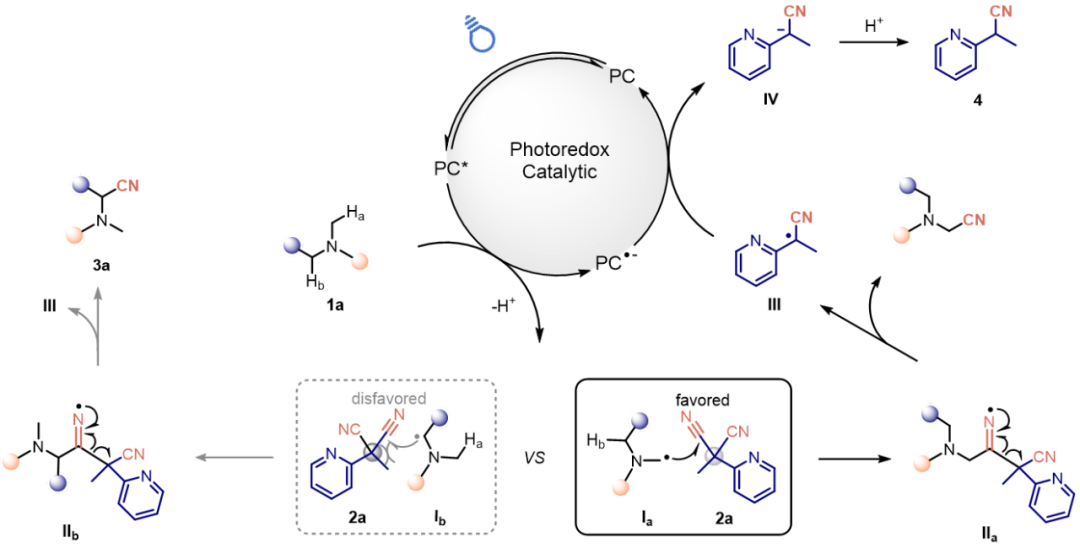 根据实验结果及已有机理研究,作者提出了胺类化合物位点选择性α-氰化反应的合理机理(图6)。在蓝光照射下,激发的有机光催化剂4CzIPN*氧化底物1a,后者经去质子化生成α-氨基烷基自由基Ia和Ib,该自由基生成过程可被视为非选择性。这些自由基对氰化试剂2a中缺电子的氰基进行亲核加成,形成亚胺自由基中间体II。该自由基加成过程受空间位阻调控而呈现位点选择性,当使用MPYMN时,空间位阻较小的自由基优先发生氰化反应,其他位点反应则被抑制。随后中间体IIa发生β-碳断裂,生成产物3a和自由基III。III与4CzIPN•⁻发生单电子转移(SET),使催化剂恢复至基态4CzIPN,完成催化循环。最后中间体IV经质子化生成副产物4。
