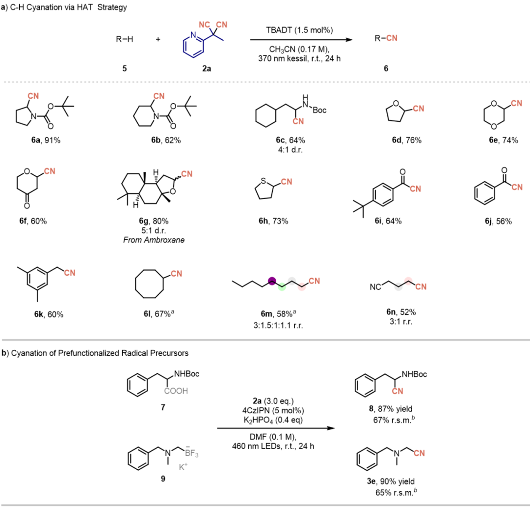 MPYMN还可以应用于预官能团化的自由基前体,实现多样化的氰化转化反应(图3b)。以MPYMN作为氰化试剂,实现了氨基酸7的可见光驱动光催化脱羧氰化反应,以87%的收率获得氰化产物。随后,在相同条件下以三氟硼酸盐9作为自由基前体,以90%的收率得到α-氨基腈。尽管这两类转化反应均需使用化学计量的过量2a,但未反应的2a在该条件下展现出优异的可回收性,可显著减少试剂浪费并提升方案的原子经济性。