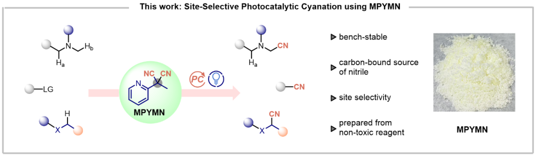 论文名称:2-Methyl-2-(pyridin-2-yl)malononitrile: a site-selective cyano transfer reagent for photocatalytic cyanation reactions