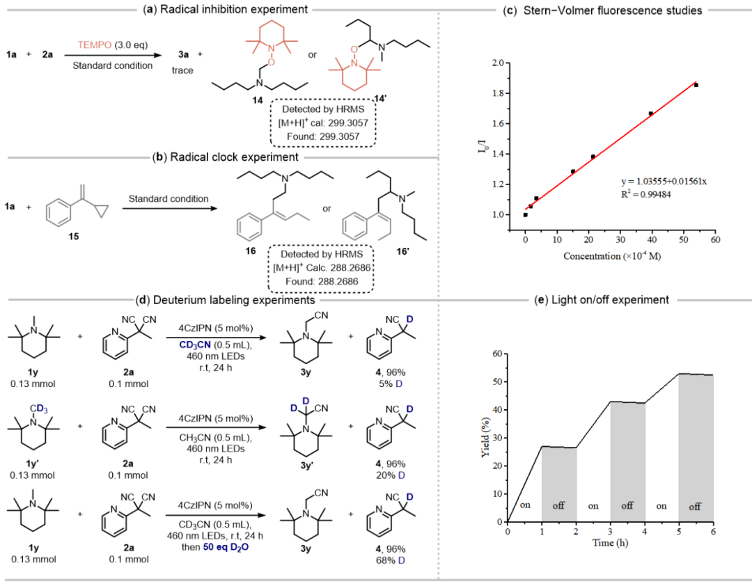 为深入探究反应机理,作者开展了一系列机理验证实验。首先,TEMPO捕获实验(图5a)和自由基钟实验(图5b)证明了反应发生的自由基路径。荧光淬灭实验表明仅有胺类底物可淬灭光催化剂的激发态,提示反应遵循氧化淬灭机制(图5c)。此外,氘代实验结果表明副产物4中的氢原子主要来源于后处理过程中的外源水及胺类底物。最后,计算所得的量子产率(Φ = 0.0049)及光开关实验排除了链式反应机制的可能性(图5e)。