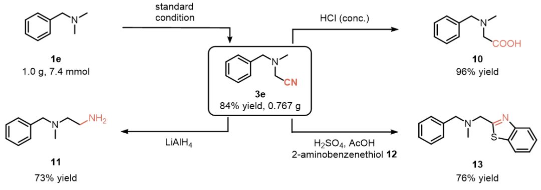 为验证MPYMN试剂在光催化氰化反应中的合成实用性,作者进行了克级规模反应,以84%的收率获得产物3e(图4)。在合成化学中,引入氰基作为关键中间体能够高效构建目标分子。将氰化产物3e进行酸性水解反应,可得到α-氨基酸10;通过LiAlH₄还原氰基获得二胺11;其与2-氨基苯硫酚12反应则生成含氮杂环化合物13(噻唑衍生物)。这些转化反应充分展现了MPYMN在有机合成中的多功能性与合成潜力。