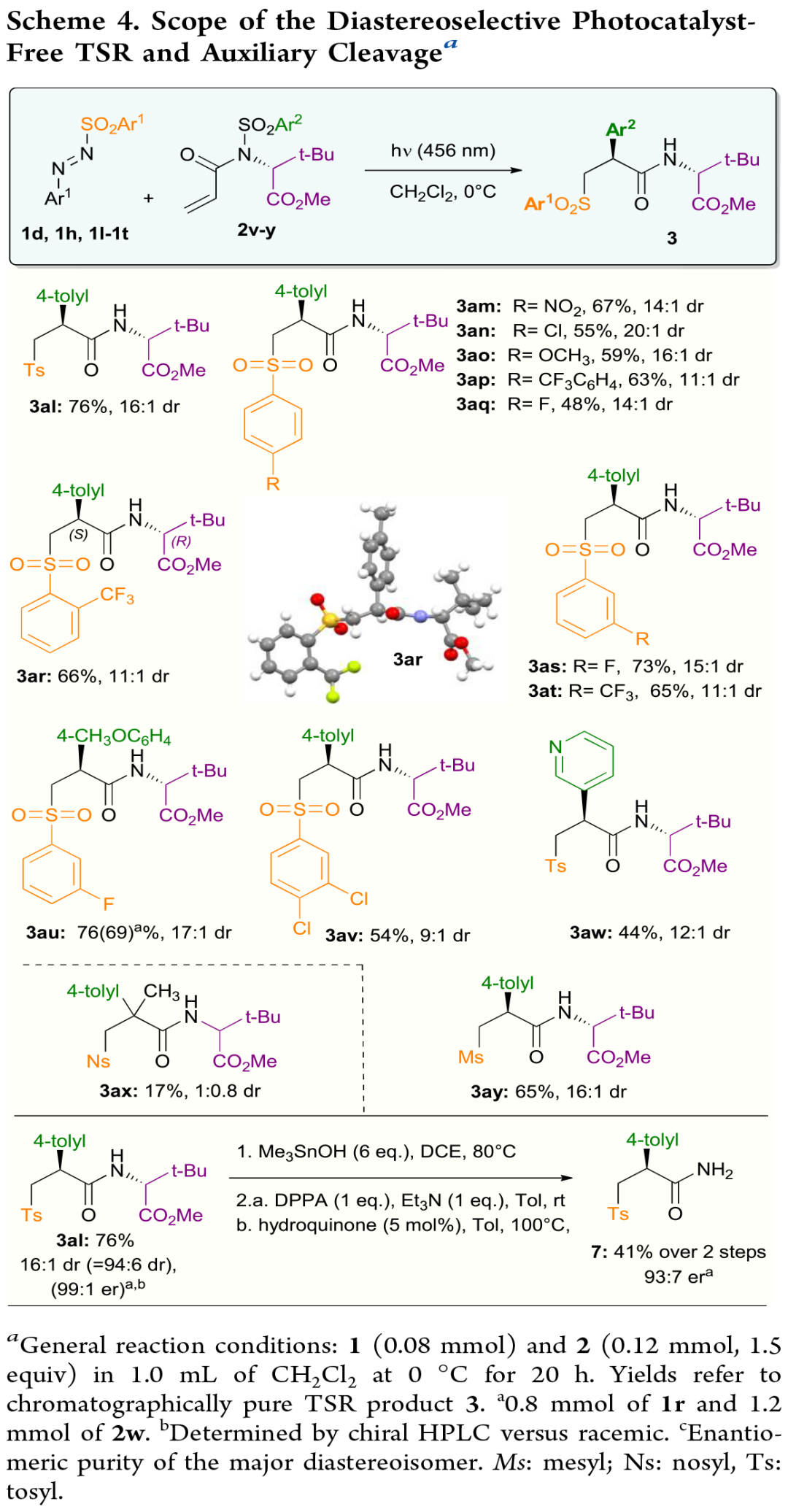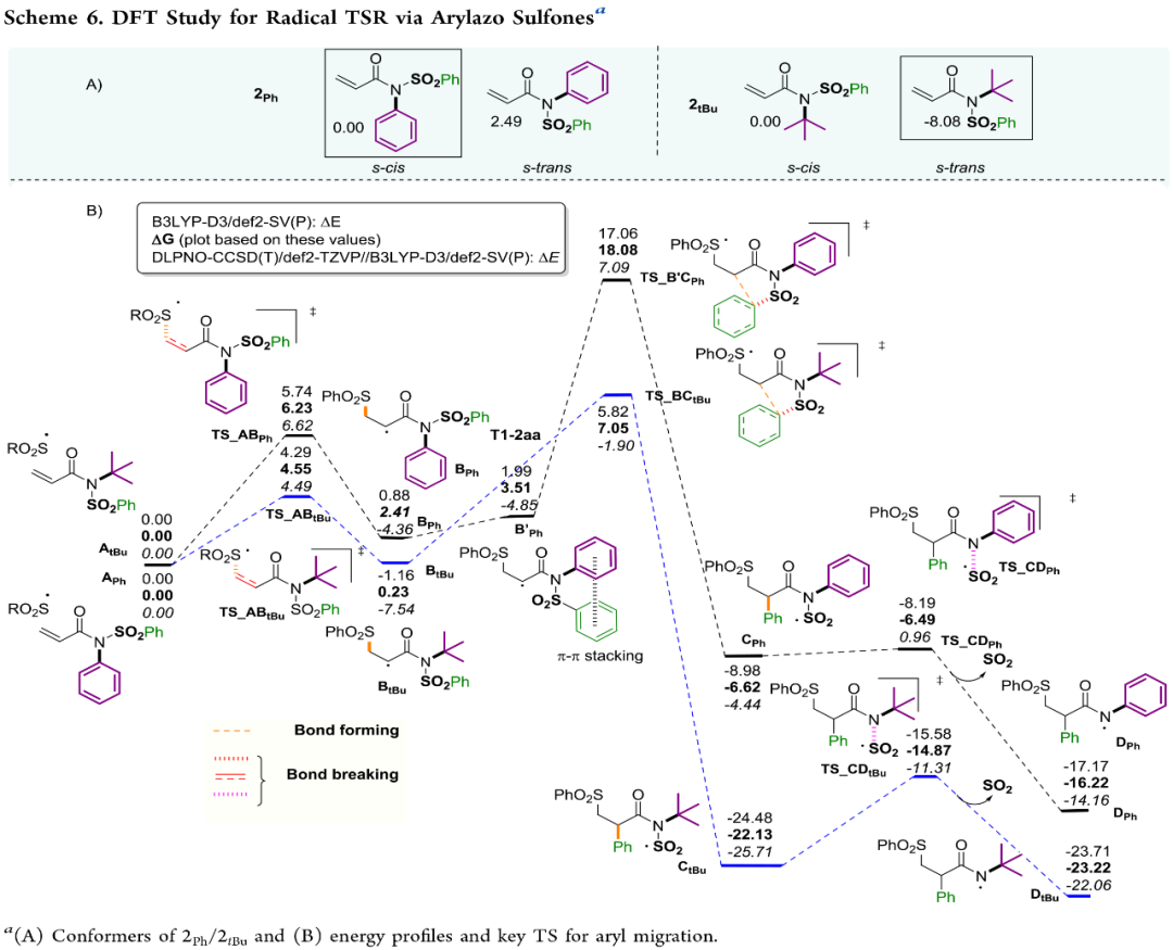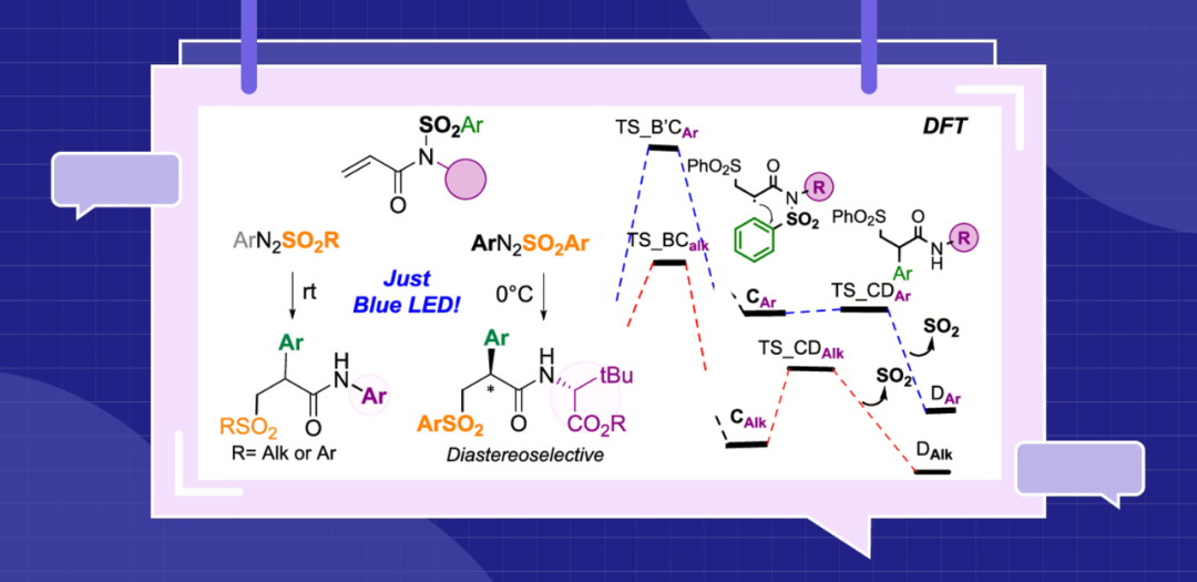 现有的大多数Truce-Smiles重排反应(TSR)方法依赖昂贵且难以回收的外部光催化剂,开发无光催化剂的策略对于降低成本、简化工艺和提高可持续性具有重要意义。巴黎萨克雷大学(Paris-Saclay University)Géraldine Masson课题组和帕维亚大学(University of Pavia)Stefano Protti合作提出了一种无光催化剂、可见光介导的Truce-Smiles重排反应(TSR),利用可光活化的芳基偶氮砜作为磺酰自由基前体,对烯烃进行选择性双官能化。该方法高效、高产率、高立体选择性地合成了β-磺酰基-α-芳基丙酰胺类化合物。此外,通过加入易于获得的手性氨基酸辅助剂(α-叔丁基-亮氨酸),本文成功地开发出了TSR反应的立体选择性变体,以优异的非对映选择性(高达 20:1 dr)提供了光学富集的α-芳基丙酰胺。DFT计算详细揭示了影响反应性和选择性的关键因素,特别是N-烷基和N-芳基丙烯酰胺的对比行为。本文研究亮点: