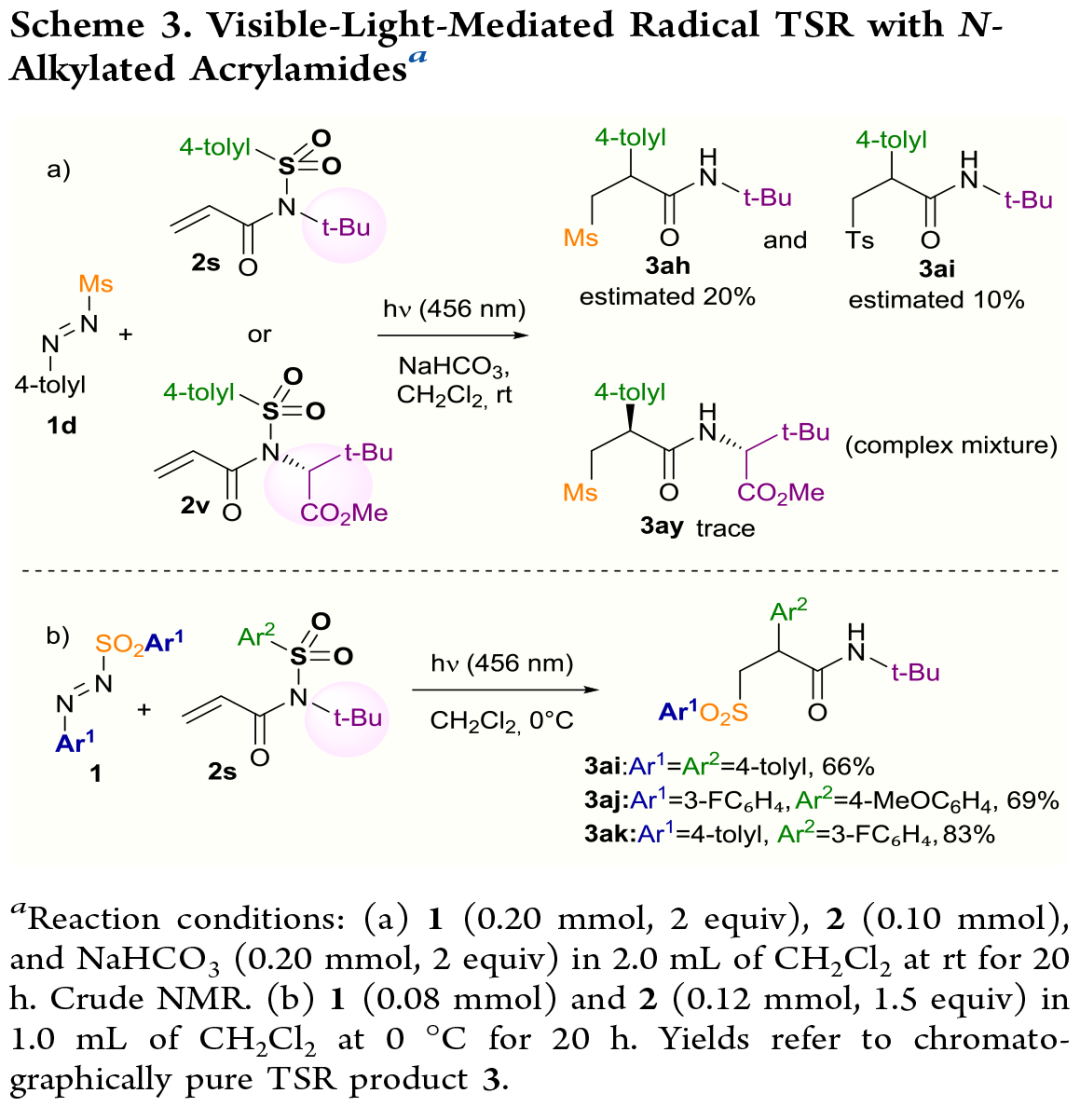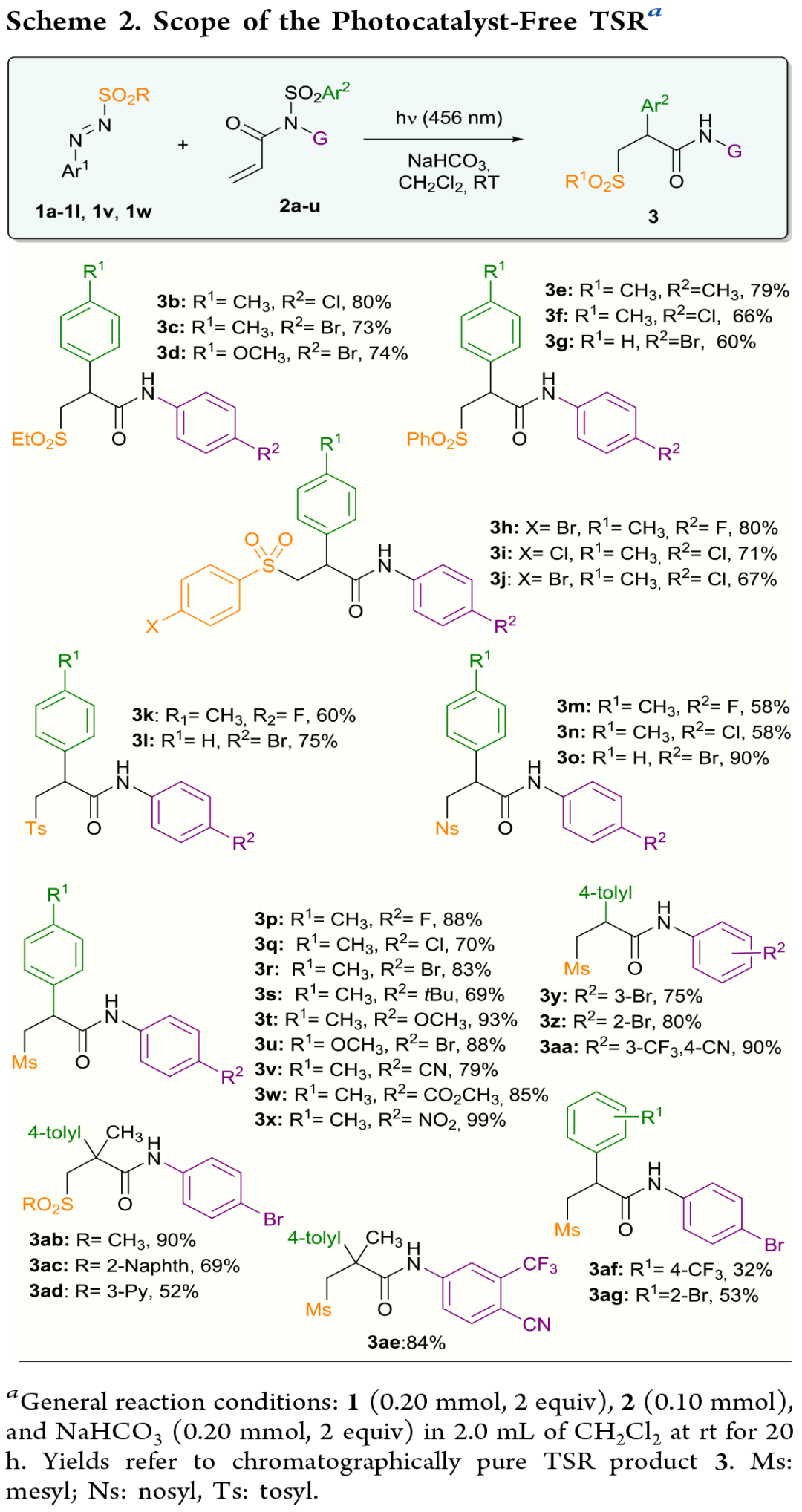 1. 卓越的化学与区域选择性:尽管芳基偶氮砜可产生磺酰基、芳基等多种自由基,存在潜在的竞争反应路径,但通过精确调控反应条件,该反应实现了高度化学选择性的磺酰基自由基加成与迁移。
