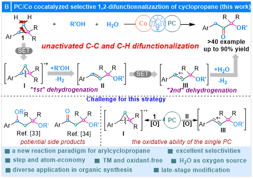 近日,西北大学左治钧教授团队在富电子环丙烷开官能团化研究中取得突破性成果。基于其在可见光催化该领域的前期工作(Angew. Chem. Int. Ed. 2024, 63, e202401579; Synlett 2025, 36, 191–198),团队发展了一种有机光氧化还原/钴协同催化体系,成功破解了富电子芳基环丙烷1,2-双官能化的选择性难题,率先实现了该挑战性的转化,填补了领域空白(图1B)。
