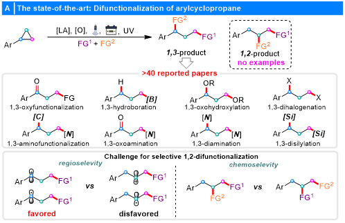 碳-碳键是构成有机分子的基本骨架,其断裂与重组转化一直是有机化学中至关重要的研究方向。环丙烷作为最小的环烷烃,因具有较高的环张力,成为实现C-C键断裂策略的理想底物。然而,尽管存在显著的环张力,环丙烷中稳定的σ键要实现可控断裂仍通常需要预先活化。目前,环丙烷的开环策略主要集中在供体-受体环丙烷(DACs)上,其邻位取代的给电子和吸电子基团可通过电子极化作用促进特定C-C键的断裂。相比之下,单供体环丙烷(如芳基环丙烷)由于缺乏足够的电子极化作用,其开环反应更具挑战性,相关研究尚处于起步阶段。迄今为止,已有多种创新方法实现了芳基环丙烷的开环双官能化反应,涵盖路易斯酸催化、强氧化剂参与、光氧化还原催化、电催化以及紫外线辐射等策略,成功实现了C-C键断裂及后续官能团的引入。自1970年代以来,已有超过40篇文献报道该类反应,但所有现有体系均局限于1,3-双官能化路径,而1,2-双官能化模式尚未见报道(图1A)。该选择性空白主要源于反应中间体的稳定性差异:区域选择性亲核开环所产生的苄位自由基或阳离子中间体,可借助p-π共轭效应获得显著稳定,其稳定性远高于高苄位中间体。这一本质差异导致亲核试剂或SOMOphile优先进攻苄位,从而使得1,3-选择性占主导地位。因此,发展能够突破该固有选择性限制、实现1,2-双官能化的新策略,不仅具有重要的科学意义,也是一项极具挑战性的研究目标。