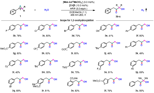 该双催化反应起始原料简单易得,反应条件温和,具有广泛的官能团耐受性,优化的条件适用苯环对位卤素取代基,其在该反应条件下兼容性良好(3b-d),为后续偶联反应提供了可能。带有酯基、乙酰基和氰基等吸电子基的芳基环丙烷也能顺利反应(3e-g)。三氟甲基(1h)和三氟甲氧基(1i)取代的底物也可兼容。含丁基(1j, 1m)、异丙基(1k)和环己基(1l)等给电子基的环丙烷同样能有效参与反应,获得中等收率。TMS官能团在该转化过程中保持稳定,以良好收率得到相应产物。当使用苯环间位或对位带有取代基的芳基环丙烷时,能以良好收率高效获得1,2-双官能化产物(3o-s)。杂环结构是药物化学中的重要骨架,值得注意的是噻吩环丙烷底物1t可顺利反应,生成对应产物3t。更具特色的是,偕二甲基取代的芳基环丙烷能选择性生成α-酮叔醇3u。然而,单取代芳基环丙烷不适于该反应(图2)。