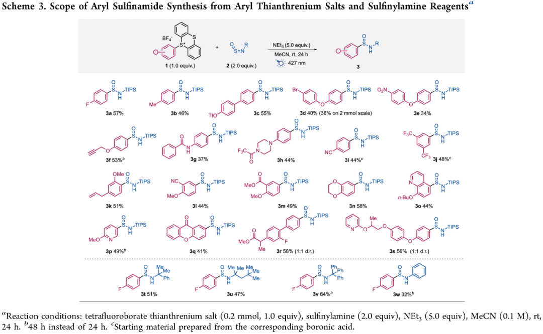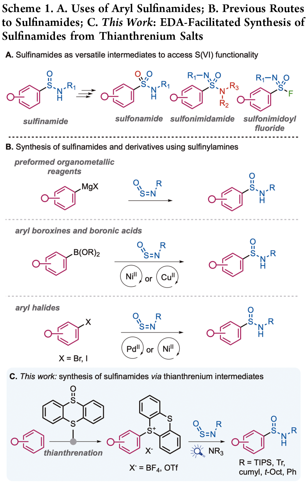 芳基亚磺酰胺是一种多功能合成中间体,可用于获得多种与药物相关的S(VI)官能团,如磺酰胺和磺酰亚胺。传统合成方法通常存在步骤繁琐、底物限制多、官能团兼容性差等问题。在此,牛津大学(University of Oxford)Michael C. Willis课题组报告了一种通过蓝光促进的电子-供体-受体(EDA)复合物实现的噻蒽鎓盐作用、位点选择性C-H亚磺酰胺化过程,从而得到关键的芳基亚磺酰胺物种。这一操作简单的过程结合了位点选择性C-H锍盐制备,然后从与现成胺形成的光活性EDA复合物进行单电子转移 (SET)。由此产生的芳基与亚磺酰基胺试剂发生反应,在温和的条件下生成芳基亚磺酰胺。