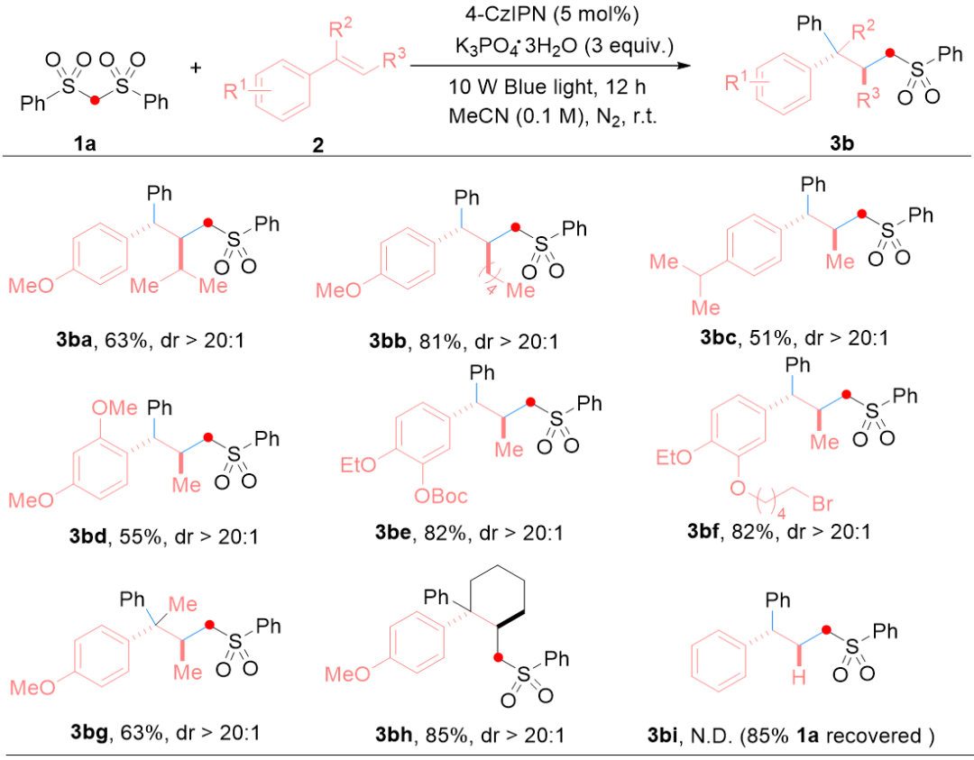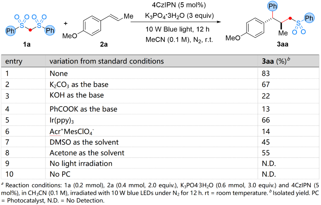 课题组首先以双(苯基磺酰基)甲烷(1a)与β-甲基对甲氧基苯乙烯(2aa)为模型底物,系统考察光催化剂、碱、溶剂及光照条件对反应的影响。实验结果显示,当以1,2,3,5-四(咔唑-9-基)-4,6-二氰基苯(4CzIPN)为光催化剂、K₃PO₄・3H₂O 为碱时,反应可顺利进行,目标烷基芳基化产物3aa的分离产率达到83%(表 1,entry 1)。进一步筛选其他碱(如 K₂CO₃、KOH、PhCOOK)时,产物产率均出现不同程度下降(表 1,entries 2-4);更换光催化剂(如 Ir (ppy)₃、Acr⁺MesClO₄⁻)同样导致反应效率降低,其中Acr⁺MesClO₄⁻催化体系的产率仅为14%(表 1,entries 5-6)。溶剂筛选实验表明,极性溶剂更有利于该级联反应的进行,其中乙腈(CH₃CN)为最优溶剂,而二甲基亚砜(DMSO)与丙酮作为溶剂时,产物产率分别降至 45%与55%(表 1,entries 7-8)。对照实验进一步证实,光催化剂与光照是反应发生的必要条件,缺失任一因素均无法检测到目标产物(表 1,entries 9-10)。