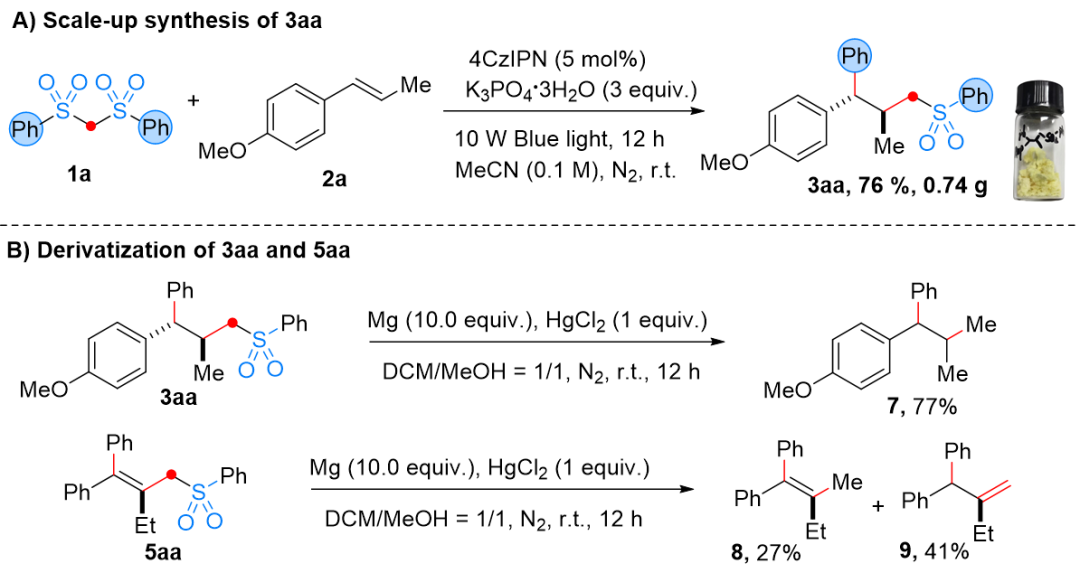 为验证该双砜试剂介导的双官能化策略的实际合成价值,课题组进行了克级规模反应:以1a与2aa为底物,在标准条件下实现克级制备,产物3aa的分离产率达到76%(图 5A),证实该方法具有良好的放大应用潜力。此外,产物的衍生化实验进一步体现其合成实用性:在还原条件下对3aa进行脱磺酰基处理,成功得到相应的烷基取代苯产物6,产率为77%;在 HgCl₂存在下,用镁(Mg)还原产物5aa,可生成烯烃8与端烯烃9的混合物(比例1:1.5,图 5B)。上述结果充分证明,双砜试剂试剂在有机转化中可同时作为烷基与芳基供体,突破了传统双砜试剂仅作为甲基阴离子或甲基自由基合成子的应用局限,为复杂分子的构建提供了新路径。