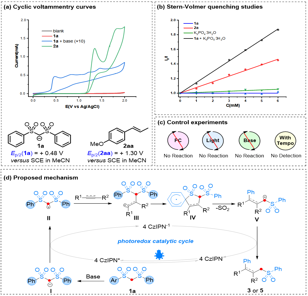 为明确反应机理,课题组开展了一系列机理验证实验。以双砜试剂1a与反式茴香烯2aa为模型底物进行循环伏安法(CV)分析,在含碱体系中,1a的氧化峰半波电位(E₁/₂)为+ 0.48 V(vs SCE,CH₃CN 为溶剂),而2aa的氧化峰半波电位为+ 1.30 V(vs SCE,CH₃CN 为溶剂),与文献报道值一致;光催化剂4CzIPN的激发态氧化电位(E(PC*/PC⁻)= +1.35 V vs SCE,MeCN 为溶剂)表明,其对1a的氧化过程在热力学上可行。Stern-Volmer 荧光猝灭实验结果显示,在碱存在下,1a可有效猝灭4CzIPN的荧光,而2aa及无碱条件下的1a对荧光的猝灭效果显著减弱,表明1a在碱作用下与光催化剂激发态的相互作用更为活跃。对照实验证实,光催化剂、碱与光照均为反应必需条件;向反应体系中加入2.0当量的TEMPO自由基捕获剂后,反应完全被抑制,且通过高分辨质谱(HRMS)检测到TEMPO与自由基的加合物,直接证实反应过程中存在自由基中间体。结合上述实验结果与文献报道,课题组提出了该级联反应的可能机理(图 6):在可见光照射下,光催化剂(PC)被激发至激发态(PC*);在碱的作用下,双砜试剂1a发生去质子化,生成的碳负离子与PC*发生单电子转移(SET),形成烷基自由基II;烷基自由基 II与烯烃加成生成苄基自由基III,或与炔烃加成生成乙烯基自由基;生成的自由基物种进一步发生分子内自由基环化,形成螺环中间体IV;中间体IV 发生断键并释放 SO₂,生成烷基自由基V;烷基自由基V与PC⁻发生单电子转移被还原,随后质子化得到目标产物3或5,同时再生光催化剂PC,完成催化循环。